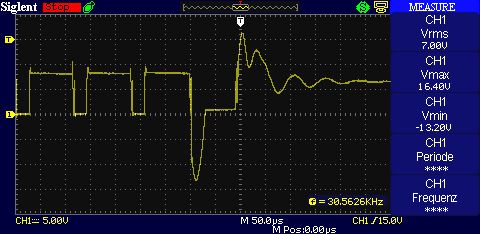 Hallo Leute, in meiner MOSFET H-Brücke inklusive Treiberschaltung (DRV8432) befindet sich ein PE-DC-Motor, den ich mittels PWM im Rechtslauf betreibe. Im Tiefsetzstellerbetrieb ereignet sich beim Ausschalten des High-Side-Switches, bzw. Anschalten des Low-Side-Switches der linken Halbbrücke der folgende transiente Vorgang: [siehe Anhang] Meine Frage ist: Wie ist diese negative und positive Überspannung bei einem entsprechend hohen Tastgrad zu erklären? Dem Bild nach zu urteilen findet hier ein Schwingvorgang statt, der kurzzeitig "deaktiviert" und wieder "aktiviert" wird. Kann ich diesen durch ein geeignetes Snubber-Netzwerk vermeiden? Mit bestem Dank im Voraus Franz Braun