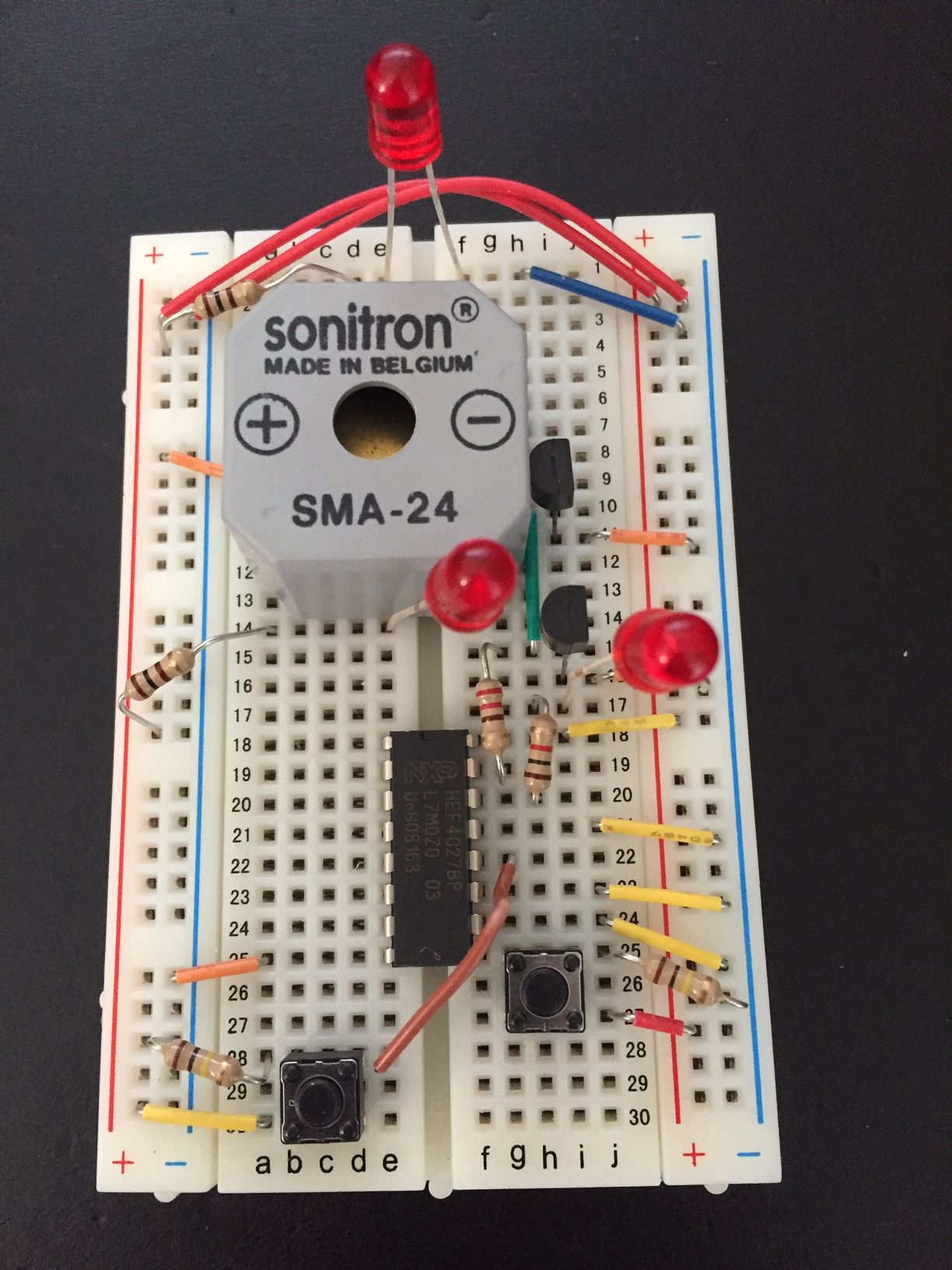 Hallo Erstmal danke für das Forum. Ich möchte das Speil "Hot Wire" oder "Heisser Draht" wie es auf Deutsch wohl heisst herstellen. Habe bereits erste gehversuche gemacht und natürlich stehe ich vor Problemen die ich versuche zu lösen. Wer es nicht kennt, es ist das Spiel wo man mit einem Stab einem draht nachfolgen soll ohne ihn zu berühren, kennt ihr sicher noch aus der Kindheit. Das ganze wird ein geschenk und ich kann dabei etwas lernen (bin nicht vom Beruf und daher elektronik Laie) Mein erster Versuch war, ein Audiosignal (habe einfach ein Klinke Kabel abgeschnitten) auf den Draht zu legen und den "Stab" an die Klinke Buchse eines Verstärkes angeschlossen. Funktionierte grundsätzlich, aber war sehr schlecht was das Störgeräusch betraf. Neuer Versuch: Eine Schaltung (grundsätzlich mehr oder weniger ein Latch mit Summer) gebastelt, eingesetzt ein CMOS JK FLipflop (HEF4027B) als Latch geschaltet und mit 2N3904 Transistoren ein Summer eingeschaltet. Drücke ich testweise den Taster dann schaltet das Latch und der Summer summt bis ich das Latch wieder resette. Testweise klappt es schonmal. Dann anstelle des Tasters an der Schaltung den Taster abgehängt und den Metallstab versucht anzuschliessen aber aber es summt sofort auch wenn der Stab nichts weiter berührt. Habe gemerkt, dass der Eingang des Chips sehr empfindlich zu reagieren scheint und vielleicht der Stab entweder HF Signale aufnimmt oder ein eigenes Potential zu haben scheint das beim Eingang des CMOS als "High" erhkannt wird. Der CMOS Chip schaltet auch wenn ich mit der Pinzette oder dem Finger den Pin auf "High" schalte. Nun suche ich Denkanstösse wie ich das korrekt lösen könnte. Wie hänge ich das korrekt an, sodass die Schaltung nur schaltet, wenn ich wirklich kontakt zwischen dem PIN des CMOS und dem Draht herstelle. Meine Idee: Wiederstand hochohmig an den Stab auf Masse (Gnd) 0V, sodass sich eventuell statische Ladungen entladen können und der Stab grundsätzlich "Low" Potential hätte. Nur leider scheint das nicht zu reichen. Im Versuch schaltet der CMOS trotzdem sofort. Kann ich da was mit einem KJondensator / Spule oder sowas machen, damit ich das Problem lösen kann? Ich bin wirklich nicht vom Fach und sicherlich habe ich viele Fehler gemacht. Ich lerne beim herstellen dieses Spielzeugs. Ein paar Grundlagen zu Elektrotechnik habe ich noch aus meiner Lehre zum Informatiker vor ca. 18 Jahren im Kopf, den Rest habe ich aus Youtube und lesen. Das Spielzeug wird ein kleines Geschenk. Fragen: - Mit welcher Software könnte ich die Scahltung zeichnen damit ich hier besser zeigen kann wie die Schaltung aufgebaut ist? - Ist mein Vorhaben grundsätzlich OK? Oder habe ich grundsätzliche Denkfehler? - Wie schliesse ich den Metallstab (und den Draht) korrekt an damit nur bei Kontakt zwischen Draht und Stab geschaltet wird? Um konstruktive Ideen und Gedankenanstösse wäre ich sehr froh. Liebe Grüsse, Manuel