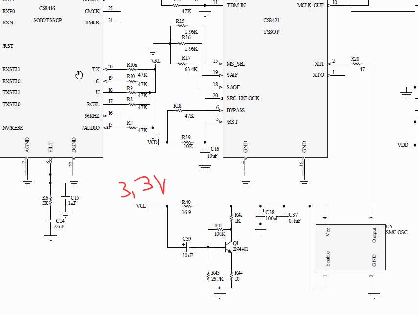 Hallo, was macht die Schaltung um Q1? An VCL liegen 3,3V. C38 und C37 sind für die Versorgung des Oscillators. Der Rest macht für mich aber irgendwie keinen Reim. Dachte an eine art Einschaltverzögerung, aber durch R42 mit 1K macht es doch keinen großen Unterschied ob Q1 durchgesteuert ist oder nicht. U5 SMC OSC ist der Oscillator im PDF Anhang. Grüße.