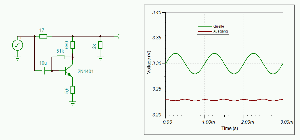 Und wo nimmt der seine 20dB her? ArnoR kam nur auf 65%, das ist ein bisschen weniger und aus dem hohlen Bauch beim Betrachten der Schaltung auch glaubhafter. Sowieso begreife ich nicht, was daran besser sein soll als ein einfaches RC-Glied oder meinetwegen auch noch eine Siebdrossel. Entweder begibt man sich als Esoteriker in Bereiche, wo die Restfehler aktiver Bauelemente stören. Dann helfen nur passive Lösungen. Oder man ist in Bereichen, wo aktive Bauelemente funktionieren. Dann mach man auch was funktionierendes. Aber das hier?