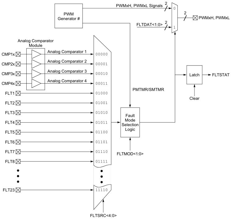 3 | FCLCON1bits.FLTSRC = 29; // Fault Control Signal Source Select bits for PWM Generator 1 => Fault22/Pin58 (FLT1H || FLT1L)