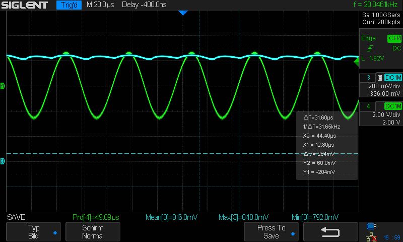 Hallo Ich experimentiere gerade mit einer Praezisionszweiweggleichrichterschaltung. Diese habe ich mit einem lmc7101q OP und 2 Shottkydioden, die ich gerade zur Hand hatte, aufgebaut. Die Diodentypen habe ich gerade nicht im Kopf. Da muss ich morgen nochmals nachgucken. Der Schaltungsaufbau mit den Widerstaenden entspricht genau der im folgenden Link. https://www.elektroniktutor.de/analogverstaerker/aktivglr.html Zuerst habe ich die Einweggl. Schaltung aufgebaut und richtigerweise das Signal wie abgebildet gemessen. Nun habe ich diese zur Zweiweggl. erweitert und messe nun irgend einen Stuss und ich weiss nicht warum. Eigentlich muesste ich ja lauter positive Halbwellen, bei denen das Signal immer wieder sinkt 0v erreicht und wieder steigt messen. Also die neg. Halbwellen einfach in den pos. Bereich hochgeklappt messen. Speisung der OPs mit 5V. Eingangssp. 5Vpp Was mkennte ich falsch gemacht haben? Wieso messe ich jetzt bereits eine Gleichspannung mit Brummspannung? Am Augang haengt ja noch kein SiebKondensator. Ich waere um Hilfe sehr dankbar