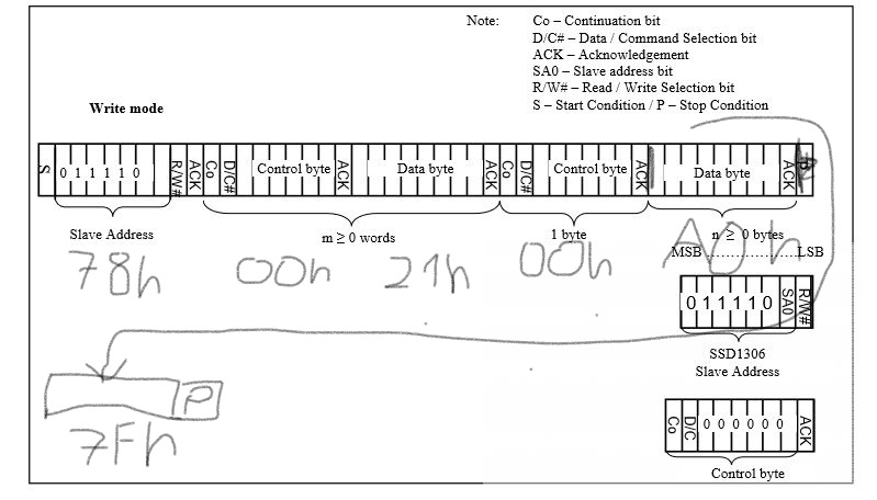 Hallo Forengemeinde, Ich habe ein kleines Verständnis Problem mit dem I2C Datenpaket, es handelt sich um ein SSD1306 Controller für OLED. Ich möchte den Command Befehl aus dem Angehangenen Bild SSD1306_1 zu dem Controller schicken. Ich würde es in dem Format schicken wie ich es "Skizziert" habe in InkedSSD1306_2_LI. Einzelne Command befehle kann ich ohne Probleme versenden, aber bei Command Befehlen die in mehreren Registern schreiben habe ich anscheinend so meine Problem. Die Slave Adresse des SSD1306 ist 0x78 für Command befehle. Ich freue mich auf eure Antworten. mfg Mathias