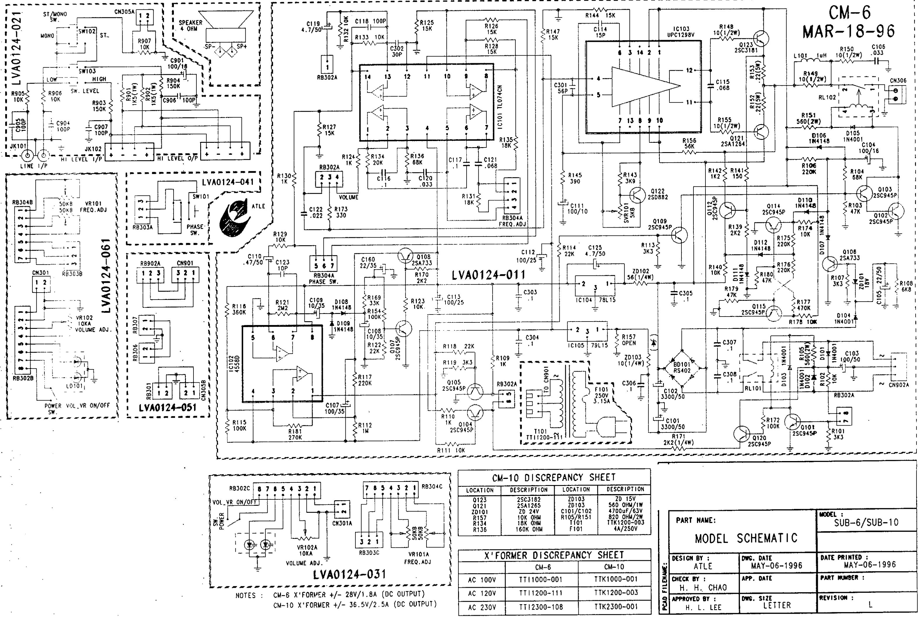 Hallo Leute, ich hab hier ein Problem mit meinen JBL Subwoofern. Irgendwann haben alle das gleiche Problem: Die Erkennung des Eingangsignals funktioniert irgendwann nicht mehr. Normale Funktion: Sub ist im Standby, kommt Musik schaltet ein Relais den Sub ein. Problem: Mit der Zeit schaltet das Relais willkürlich, auch ganz ohne angeschlossene Quelle ein und aus. Kurz vor dem Sterben (also dass er gar nicht mehr einschaltet) schaltet das Relais immer sehr schnell, klakkert. Könnte mir mal jmd einen Tipp geben wo ich in der Schaltung mal suchen müsste? Schaltplan ist anbei. Ich bedanke mich schon mal herzlich, Basti