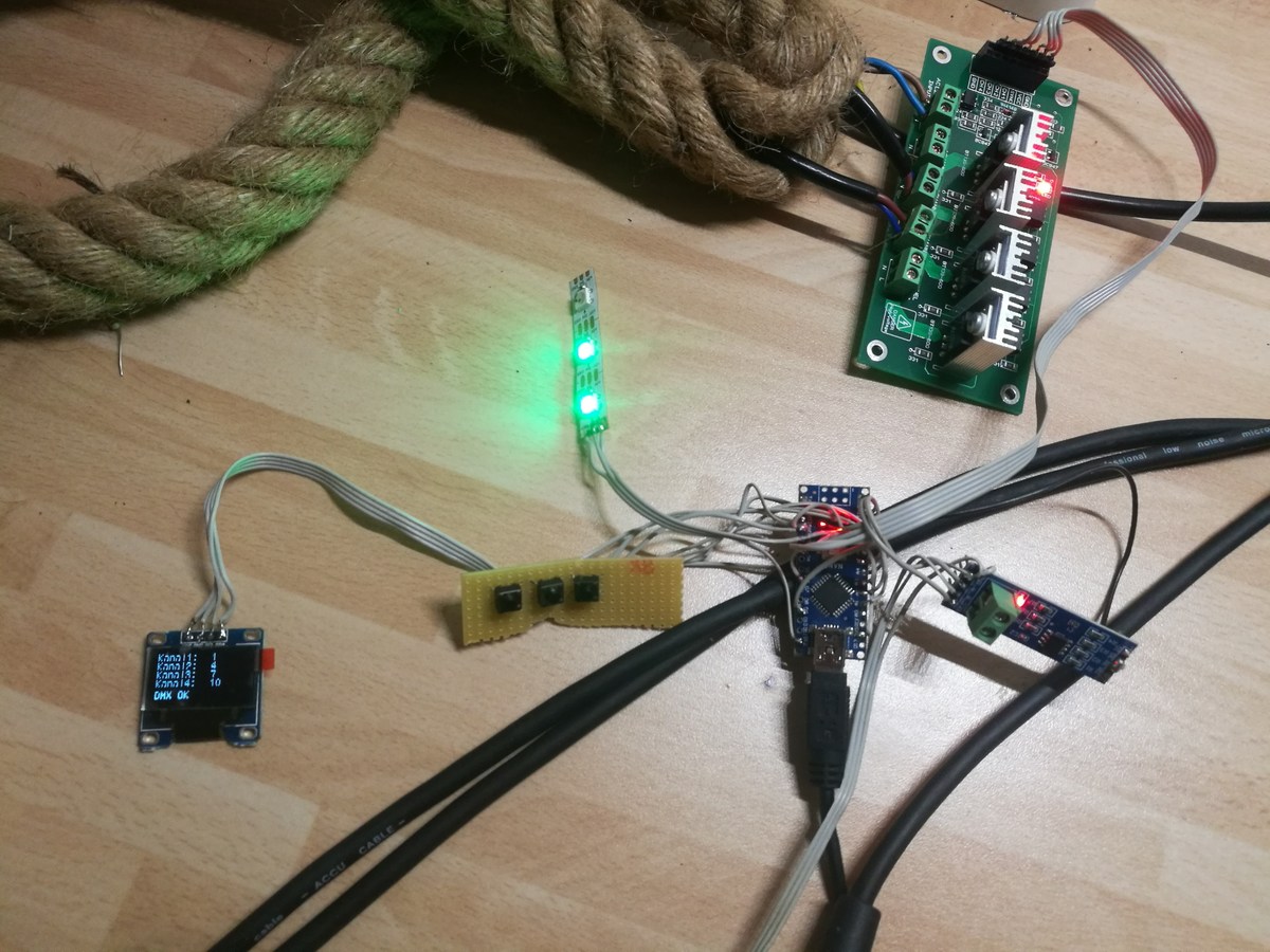 Hallo Patrick, es freut mich das dir dieses Projekt gefällt. Es freut mich, dass dir mein Projekt wie du mir in der Mail geschrieben hattest weitergeholfen hat. Am Code habe ich nichts mehr geändert. Glaube der letzte war demux5.ino aber ich muss auch dazu sagen, dass ich den nur hin und wieder als Strobe Controler für meine analogen Strobes verwendet habe, also keine Langzeittests etc pp. Auch die Triac Zündung habe ich nicht mit einem Oszi geprüft. Die Menüführung sollte eigentlich aus dem Sourcecode ersichtlich sein. Oder einfach mal auf nem Steckbrett nachstecken und testen. Die WS2811 Stripes geben nur den Status des Kanals aus, bzw ob ein DMX Signal anliegt. Für Macros bzw Chaser wirst du mit meinem Code und nem Arduino Nano leider wenig Erfolg haben da der Sketch nahezu 100% des Speichers belegt. Da evtl Teile rausnehmen oder auf eine andere Hardware switchen. Für die Steuerung von LED Stipes würde ich eher auf nen anderes Projekt Switchen. Da gibt es in google zahlreiche ES8266 Artnet Projekte die die Stripes ansteuern. https://github.com/mtongnz/ESP8266_ArtNetNode_v2 Für das Projeckt habe ich so keinen Schaltplan. Aber im Sourcecode solltes du eigentlich rauslesen können wie der Aufbau aussieht. Buttons an Pin 15,17,16 gegen GND Strobes/ Triacs oder Relais an Pin 6,9,10,5 OLED an A4 und A5 Max485 an RX Pin (Trennen wenn du den Sketch hochladen magst) WS Stripes am Spi Ausgang Hoffe das hilft dir weiter. LG Heiko