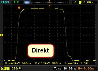 Salü Holger, ist dein Problem noch aktuell? Zufällig bin ich darauf gestossen. Da ich vor einigen Jahren dasselbe Problem hatte (Erzeugung sehr steilflankiger Rechtecksignale mit möglichst einfachen Mitteln), kann ich folgendes sagen: Es ist ziemlich trivial, mit modernen Gattern Anstiegszeiten weit unter 1ns direkt in ein 50-Ohm Last zu erreichen. Wie Du im Oszillogramm im Anhang siehst, sind um die 300ps problemlos. Die Schaltung ist ziemlich trivial aufgebaut (fliegend, von Hand gelötet), es ist lediglich auf minimale Induktive Parasitäten zu achten. Ich habe als Stützkondensatoren übrigens 100nF/0402/X7R Typen verwendet. Die Parallelschaltung verschiedener Grössen (10p/1n/100n usw.) bringt nichts und kann sogar schaden. Ich empfehle es nicht. Nimm immer eine möglichst grossen Wert in möglichst kleiner Bauform (0402 kann man gerade noch von Hand Löten) und ein Klasse-2 Keramik. Mit ECL-Gattern oder -Treibern kann man natürlich noch schnellere Pulse erzeugen, ebenso mit Avalanche-Transistoren. Wie gesagt: Für <500fs reichen diskrete Gatter aber noch gut aus. Schöne Grüsse! Mark