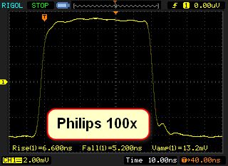 Folgen noch ein paar Ergebnisse mit dem provisorischen Schaltungsaufbau. Anstiegszeit direkt am Eingang vom Rigol DS1054Z über einen BNC-Adapter mit Federzugklemmen jetzt konstant bei 2,2 ns. Mit einem schlecht HF angepassten Philips Tastkopf messe ich sogar 1,4 ns. Für ein 50 MHz Oszilloskop original im Lieferzustand sind das erstaunlich schnelle Messungen und weit besser als die technischen Daten vermuten lassen. Das alte Rigol DS1042C hingegen kann da keineswegs mithalten, trotz Firmwareupdate auf das 100 MHz Modell DS1102C, es ist und bleibt ein 40 MHz Modell. Einige Bilder von Messungen mit schnelleren Tastköpfe habe ich beigefügt. Die Standard-Ausführung und welche 100 bzw. 150 MHz sind deutlich schlechter daher erst gar nicht gezeigt. Erstaunlich gut schlagen sich die uralten Tektronix Tastköpfe aus dem Jahr 1977 mit angeblich nur 50 MHz und sogar 2m Kabellänge. Die lassen alles an modernen Standard-Tastköpfen alt aussehen. Sie sind mir schon immer aufgefallen, dass sie die Kurvenformen am wenigsten verzerren, demnach über alle Frequenzen sehr gut abgeglichen sind und das über 40 Jahre. Auch der 100x Philips-Tastkopf ist sicherlich schon uralt. Mit nur 2pF bei 20 MOhm, 1,2ns Anstiegszeit und 4 kV Spannungsfestigkeit mal was Außergewöhnliches. Allerdings muss ich seine 3 Potis und 3 Trimmkondensatoren noch richtig abgleichen. Somit bin ich schon einmal recht zufrieden, ich hoffe dass mit einem sauberen Aufbau alles noch etwas besser wird.