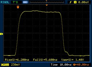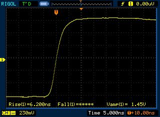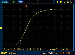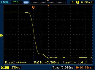 Am alten Rigol DS1042C (mit DS1102C Firmware) war die Anstiegszeit allerdings sehr langsam (6 ns) und nicht schneller als ein Atmega-Pin. Am Hameg 408 mit ca. 7 ns Anstiegszeit das gleiche. Am Rigol DS1054Z sah es dann besser aus, ca. 3 ns Anstiegs- und Abfallzeit. Vermutlich ist mein Rigol nicht schneller, obwohl ich schon Messungen mit 1,2 ns Anstiegszeit mit einem DS1054Z gesehen habe. Erste Erkenntnis, das alte Rigol DS1042C bleibt leider ein 40 MHz Oszi auch wenn man die Firmware auf 100 MHz umprogrammiert, sehr schade. Das Hameg mit ca. 7 ns ist halt auch nur ein 40 MHz Oszi. Das Rigol DS1054Z hat wohl tatsächlich eine 100 MHz Hardware verbaut. Zurück zur Schaltung, was die jetzt wirklich leistet kann ich nicht messen. Die 3V (5-2V) als Bezugsspannung ist vermutlich überflüssig, 2 x 470 Ohm nach GND sollte auch funktionieren. Teste ich ggf. noch. Messungen zwischen Ausgang und 3V sind unsauber, das Spannungsniveau schwankt zu stark. Soweit ein erster Zwischenstand.