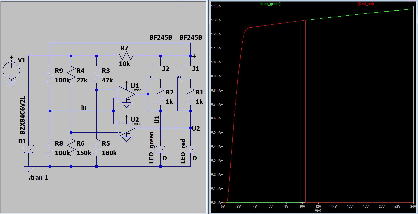 Libbie schrieb:> Geht das, dass ich mit nur einem Komparator die LED zum Beispiel bei 10V> und niedriger rot leuchten lasse und alles über 10V grün?