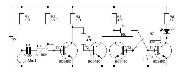 Hey, Ich bin noch ein Anfänger und versuche gerade folgende Schaltung zu verstehen. Diese Schaltung fängt z.b beim klatschen an zu leuchten und kann durch den mikrotaster resetet werden. Also erstens habe ich gelesen das r2 so dimensioniert ist das sich der Transistor im Grenzbereich befindet und schon leicht durchsteuert, aber warum will man das er schon leicht durchsteuert und was heißt er befindet sich im Grenzbereich? Werde auch durch das Datenblatt nicht schlau. http://dieelektronikerseite.de/Lections/Mikrofone%20-%20Elektronischer%20Lauschangriff.htm (Hier steht das mit dem Grenzbereich) Außerdem habe ich hier bei einer ähnlichen Schaltung gelesen das durch die zusätzliche Spannung des Mikrofons der Transistor sperren würde, aber wieso sollte er sperren? Das macht er doch nur wenn die Spannung an der Basis gegen 0 geht. Beitrag "Klatschschaltung berechnen" (Hier steht das mit dem sperren) Hab die Schaltung mal simuliert in der Simulation ist die Spannung an der Basis von t1,t2 und t3 bei 0,54V was ja bedeutet das alle im Grenzbereich liegen würden und nur t4 gesperrt ist(wenn Leuchtdiode aus). In der Simulation sehe ich halt nur wie es aussieht bevor die Leuchtdiode an ist und wie es aussieht wenn sie an ist. Jetzt fällt es mir aber umso schwieriger zu verstehen was genau in dem moment des z.B. klatschen an den Transistoren passiert.