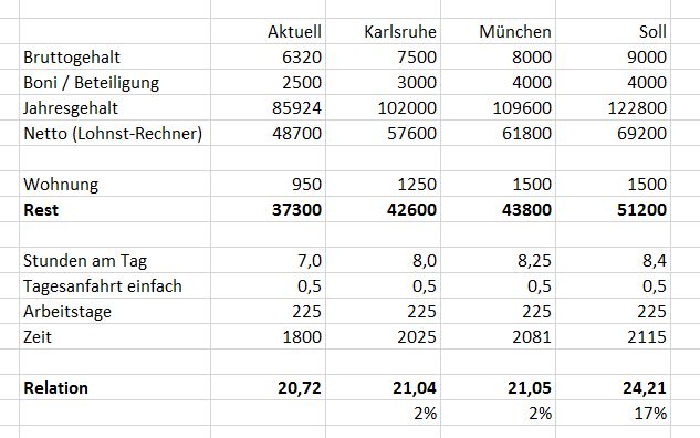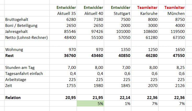 So, der Herr Vermittler hat sich gemeldet und bot für die Teamleiterstelle in München 8500,- an, zusätzlich geschätzte 4000,- Bonus im Jahr. Das wäre das doppelte von meinem momentanen Bonus. Aber trotzdem reicht es nicht. Die Wohnungen kommen mit Nebenkosten in München locker auf 1500,- im Monat, wenn ich es mit meiner vergleiche. Ich vermute auch, dass ich gfs noch mehr Anfahrtszeit haben werde. Eine ähnliche Stelle in Karlsruhe ist auch nicht wirklich besser dotiert. Das sind alles Billig-Teamleiter wie mir scheint. Als Entwickler mit 35h biste besser dran!