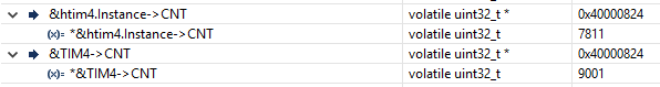 Folgendes Problem. Ich habe hier einen STM32F407 Mikrocontroller und will einen AB-Encoder auswerten, indem ich die Steps mittels Timer 4 zähle. Konfiguration ist mit CubeMX erstellt. Mit den HAL Treibern gibt es für die Timer jeweils einen TIM_HandleTypeDef, welcher letztlich auch nur ein Pointer auf die Register ist. Zusätzlich gibt es ja noch die Möglichkeit, mittels TIM4->... auf die Register zuzugreifen. Ich habe einen weiteren Timer eingerichtet, der nach 2 Sekunden auslöst. In diesem Timer will ich zunächst nur den Zählerstand vom Encodertimer auslesen. Bringt mir zwar noch nicht viel, aber das ist jetzt egal. Ich nutze SW4STM32 und nutze da den Variablen Watcher um mir den Inhalt der beiden Pointer anzuzeigen. Jedoch unterscheiden sich die Werte bzw. deren Inhalt (siehe Bild 1 im Anhang). Wechsle ich direkt zu dem Register Viewer im SW4STM32, habe ich da wieder einen anderen Wert (bild 2). Ich habe nirgends einen Schreibzugriff auf das Register, nur lesen. Wo könnte der Fehler sein?