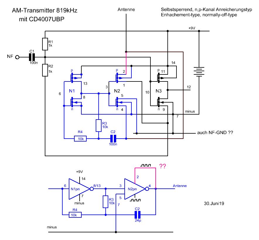 Hallo, guten Tag! Das ist ein Sender für Mittelwelle "819kHz", näher beschrieben hier: http://www.elektronik-labor.de/Lernpakete/Kalender12/AMmodulator.html Leider ist der Minusanschluß für NF nicht eingezeichnet. 900kHz werden zwar erzeugt, aber es gibt keine Modulation. Ich habe schon viel rumprobiert, aber ohne Erfolg! Wie auch, ohne Minusanschluß für die NF? An GND angeschlossen geht es nicht, an "12" angeschlossen auch nicht. Der Autor hatte folgendes geschrieben: "Im Grunde wirken die FETs P3 und N3 als veränderlicher "Vorwiderstand", der die Betriebsspannung für den Rechteckgenerator entsprechend der NF "schwanken" läßt". ????? Ich habe versucht, die Schaltung übersichtlich aufzuzeichnen. Blaugezeichnetes im Plan soll für den Multvibrator zuständig sein. Wer erklärt mir mal die Schaltung? Wie soll das Ganze funktionieren? ...und vor allen Dingen: wo wird der Minus von der NF angeschlossen? Vielen Dank schon mal im voraus.