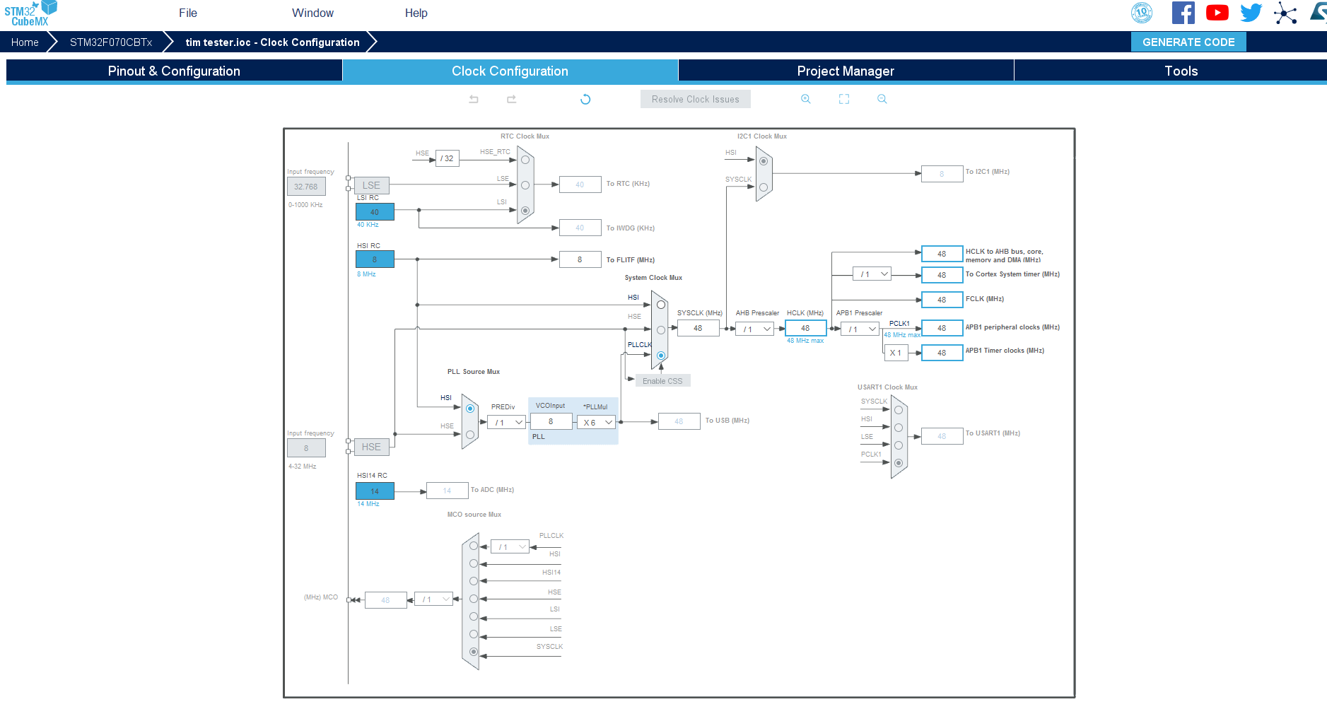 Hallo zusammen Was ich möchte: Eigentlich ganz simpel nur ein PWM Signal am Pin eines uC. (Duty Cycle ist erstmal egal) Was ich gemacht habe: Ich verwende den STM32F070CB mit HAL. Mit Cube hab ich mir den Initialisierungscode generieren lassen. (PB9 / TIM17_CH1) Das ganze starte ich dann mit dem Befehl HAL_TIM_PWM_Start(&htim17, TIM_CHANNEL_1); Nur leider tut sich nichts. Wenn ich aber den Code im Debugger laufen lasse, kann ich meinen PWM am Ausgang mit dem Oszi messen. Ich vermute, ich habe irgendetwas bei der Initialisierung vergessen, das der Debugger von sich aus macht, vermutlich irgendeine CLK Zuweisung. Was ich noch versucht habe ist mit den Makros __HAL_RCC_GPIOB_CLK_ENABLE(); und __HAL_RCC_TIM17_CLK_ENABLE(); den Clock des Timermoduls zu aktiveren, hat aber auch nichts gebracht. Hat jemand eine Vermutung an was das liegen könnte? Ich habe meine Einstellungen im Cube und das Main file angehängt Grüsse