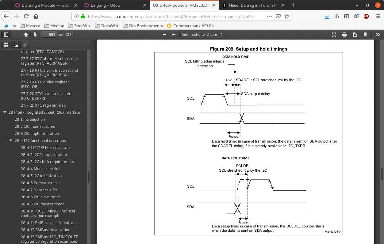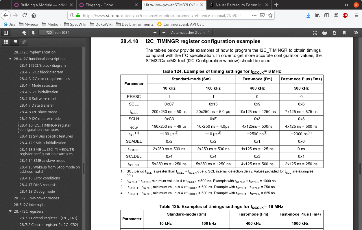 https://www.st.com/content/ccc/resource/technical/document/reference_manual/2f/b9/c6/34/28/29/42/d2/DM00095744.pdf/files/DM00095744.pdf/jcr:content/translations/en.DM00095744.pdf In der Beispiel-Tabelle ist bei 100 kHz SCL-Low=5µs und SCL-High=4µs. Da hat man bewusst eine µs subtrahiert. Laut Fußnote 2 ist das ein Beispiel unter der Annahme, dass tync1+tysnc2 eben diese 1µs ausmachen. Also wenn der Bus z.B. lange Leitungen (=viel Kapazität =flache Flanken) hat, dann ergeben sich längere Zeiten, als bei kurzen Leitungen. Habe ich das richtig verstanden? Das würde dann ja auch bedeuten, dass die Übertragungsrate nicht alleine von der Konfiguration des Mikrocontrollers abhängt, sondern von außen beeinflusst wird (Clock-Stretching durch den Slave mal außen vor gelassen). Richtig? Dann habe ich noch eine zweite Frage: Das Referenzhandbuch empfiehlt für SDADEL Werte >0, sagt aber auch, dass man CubeMX für die Berechnung benutzen soll. CubeMX setzt hier bei Verwendung der analogen Filter aber immer den Wert 0 ein. Was ist denn nun richtig, und wie berechne ich einen sinnvollen Wert? Dazu habe ich keine klare Vorgabe gefunden. Vermutlich habe ich wie immer einen relevanten Absatz an ganz anderer Stelle im Referenzhandbuch übersehen.
