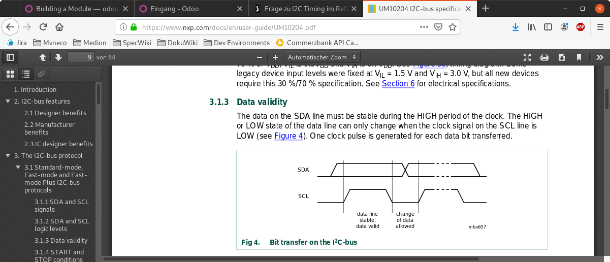 Klaus schrieb: > Wenn ich die Spec richtig lese, darf sich SDA frühestens 0ns nach der > LOW-Flanke und spätestens 250ns vor der High-Flanke ändern. Das scheint > mir eindeutig. "The Data on the SDA line must be stable during the HIGH Periode of the clock" steht doch im Widerspruch zu "darf sich SDA .... und spätestens 250ns vor der High-Flanke ändern", oder? Die Zeit während der Clock auf HIGH-Pegel ist, ist doch kürzer als die Zeit von spätestens 250ns vor der High-Flanke bis zur Low-Flanke. Es widerspricht auch zum Diagramm im Dateianhang.