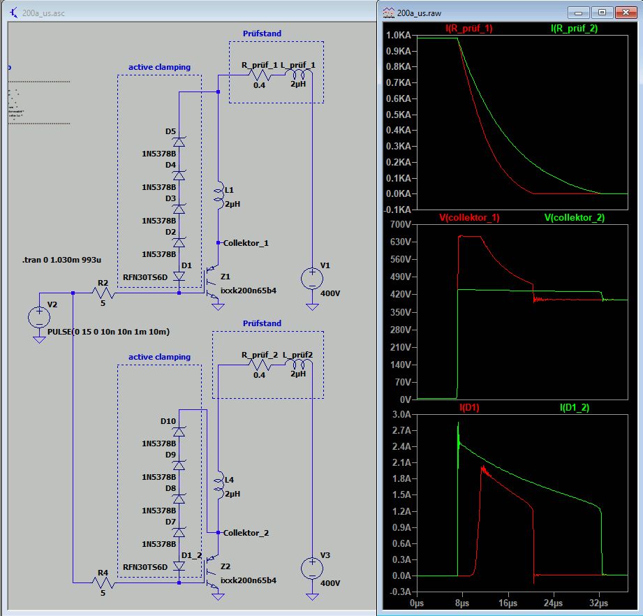 MiMa schrieb: > Nö immer noch nicht. Nimm meine Simulation und versuch es mal. Dann > wirst du schon sehen wie es funktioniert. bei mir funktioniert die genau gleich wenn man alle dioden rausnimmt (ohne clamping), der Strom durch die Dioden (1N5378B) ist bis ca. 0.2ms vor Ende des Ausschaltens genau 0mA (er steigt von einigen pA auf einige µA, das wars, statisch ausgeschaltet ist der dann ca. 10mA) dafür sieht man auch schön dass die Spannung über dem IGBT auf deutlich über 400V ansteigt, sogar fast das doppelte (670V, ich habe aber nicht genau dieselbe igbt lib, könntest du mal hochladen). Fazit -> da clampt nichts, vor allem nicht aktiv, die Dioden machen mal genau nichts. klemmt man die Dioden richtig an (hinter der Spule) und verringert die Induktivität auf ca. 0.5µH, passt die Zeit wieder ungefähr und die Spannung über dem IGBT bleibt unter 440V, die Dioden müssen auch peak 2.2A verkraften. Ufgrutz schrieb: > MiMa's Schaltung ist so wie sie gezeichnet wurde falsch, die Diode muss > direkt am Kollektor angeschlossen sein. sehe ich genau so, wers nicht glaubt lasse sich bei der Simulation mal die Spannung über dem IGBT anzeigen.