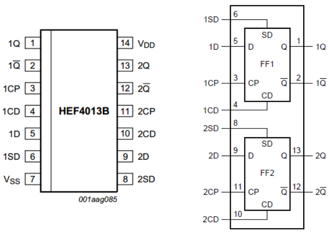 Ich habe einen HEF4013B, ist das der gleiche? Wie würde ich den HEF4013B anschließen? Ich habe versucht das Rechtecksignal auf Pin 3 (CP) zu legen, Pin 2 (/Q) und Pin 5 (D) zu verbinden und bei Pin 1 (Q) das 1/2 Rechtecksignal zu messen, jedoch war das ausgangssignal gleich dem Eingangssignal. Pin 7 (Vss) war auf Gnd und Pin 14 (Vdd)auf 10V.