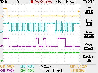 Max G. schrieb: > der erste Verdächtige bei so etwas sind immer die CPOL/CPHA-Settings. die passen aber. Die Einstellung bei CubeMx seht ihr ja oben auf dem Foto. Erste Flanke ist fallend. Also SCK bei nicht betätigung High. Und gesammelt wird auf der zweiten Flanke. So ist es beim At90Can ja auch da die beiden Bits 1 sind. Ich hab euch den ausschnitt aus dem Datenbaltt angehängt. Max G. schrieb: > Bei den 200kHz, mit denen du klapperst, sollte ein nicht völlig abartig > gerouteter SPI-Bus nicht zu elektrischen Problemen führen. Dazu hab ich mich jetzt nochmal schlau gemacht. Das hängt ja nicht mit der Taktrate sondern mit der steilheit der Schaltflanke zusammen. Also ob ich z.B. reflexionen bekomme. Hier hab ich zu dem Thema was gutes gefunden: https://www.google.com/url?q=https://homepages.thm.de/~hg7313/lehre/avt/skript/avt_hightechspeed_bg_kap2.pdf&sa=U&ved=2ahUKEwj14sD-87vjAhVHZVAKHU89DQ4QFjAAegQICBAB&usg=AOvVaw354T9S4hcUpXuoJObx5IaI Bei meinem Controller kann man diese Flankensteilheit einstellen. Ich hab die jetzt mal auf das langsamste gestellt und messe mit meinem Oszi einen tfall time von ca. 10ns. Da die Zeit aufgrund der Kapazität vom Messkopf ja länger wird teile ich den sicherheitshalber durch 2. Das dann mal 5 = 25cm kritische Leitungslänge. Ich werde die Leitungen jetzt einfach so kurz wie irgendwie möglich machen und direkt verlöten. Dann sollte ich Reflexionen als Fehlerquelle auch ausschließen können. Peter D. schrieb: > Quelltext kann man am besten lesen, wenn man ihn als *.c postet und > nicht als png. Sry. Mach ich beim nächsten mal anders. Peter D. schrieb: > Da besonders, der Slave kann sich verzählen. > Wichtig ist eine gute GND-Verbindung, da kann man ruhig stärkeren Draht > nehmen und so kurz wie möglich. Ok. Ich kürze gleich die Leitungen nochmal und dann versuche ich es nochmal. Warum genau die 100 Ohm? Hatte n bisschen was darüber gelesen aber die Serienterminierung hab ich irgendwie nicht verstanden :D. Darth Moan schrieb: > man kann nicht sehen, was du wirklich machst. In F0004TEK.jpg > wird 0x0004 0x07C2 gesendet. Also ein RDCVA. Hast du vorher eine > Wandlung gemacht? Genau. 0x0004 ist der Befehl 0x07C2 ist der entsprechende PEC. Darth Moan schrieb: > Wenn keine Wandlung erfolgt ist, oder das Register gelöscht > (CLRCELL) wurde, enthällt es 0xFFFF 0xFFFF 0xFFFF. Nur die PEC müsste > ungleich 0xFFFF sein, aber die liesst du nicht ein. Dein Transfer ist > also zu kurz. Denn 6 Byte Register + 2byte PEC sind eben 8 und nicht 6. Das Stimmt natürlich. Ich Dummkopf hatte im AT90can controller in der While Schleife einmal Zellspannungen lesen. Den Befehl hat er dann natürlich gesendet bis ich ihn Debugt habe. Da ich den IC dann zwischen dem Durchlauf vorm Debugen und dem Lesen Aufruf beim Debuggen nicht vom Strom getrennt habe wurde der Wert dann gespeichert. Vielen Dank! War ziemlich dumm von mir! Darth Moan schrieb: > Oder sendest du dieses Kommando direkt nach > dem Wecken? Das Commando ist das Wecken. SS muss ja dafür nur auf low gezogen werden oder es muss sich was auf der SCK tun. Mein Problem ist jetzt nur erstmal nur noch das ich diesen Timeout duration parameter nicht ganz verstehe. Das ist doch nur die Zeit nach der der uC die Kommunikation abbrechen soll wenn er die Flag nicht bekommt oder? Damit er sich nicht aufhängt. Wenn ich beim Empfangen 1ms nehme wird der PEC abgeschnitten bei 2ms nicht. Das Mosi Signal dauert aber nur 800µs. VIELEN DANK FÜR EURE BEITRÄGE !!!!!!