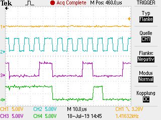 Ich habe meinen Aufbau jetzt nochmal neu mit kürzeren Leitungen aufgebaut. SPI funktioniert auch soweit. Ich habe mir die Signale nochmal angeschaut. Irgendwie habe ich noch Schwingungen auf den Leitungen. Ich habe aber keine Ahnung wo die so wirklich herkommen. Es wäre auch mal interessant zu wissen welche Schwingungen bzw. Störungen akzeptabel sind. Dafür habe ich noch kein wirkliches Gefühl. Hab ich auch noch nie was zu gelesen. Die Kanäle vom Oszi sind (Von oben nach unten): SS SCK MOSI MISO Soll ich das einfach so lassen? Ab welchem Wert ist es nicht akzeptabel? Was vermutet ihr wo die Störung herkommt? Vielen vielen Dank für eure Beiträge