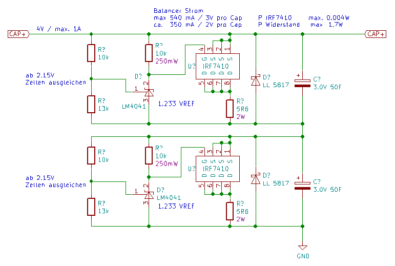 Hallo!, arbeite gerade an einer Stromversorgung für ein GSM Modul. Um Leistungsspitzen abzufangen, möchte ich zwei Supercaps in Reihe verwenden. Da die Wahrscheinlichkeit groß ist das die Zellspannungen mit der Zeit driften und eine Zelle überladen werden könnte, habe ich mir eine kleine Balancer Schaltung überlegt. Diese sollte, wenn ich mich nicht verrechnet habe, <300µA im Standby benötigen. Für das Laden hätte ich jetzt einfach ein 0815 LiXX Lade-IC verwendet. Jetzt wollte ich einmal nachfragen, was Ihr von der Schaltung haltet. Kann man das so lassen? Gruß, Tim