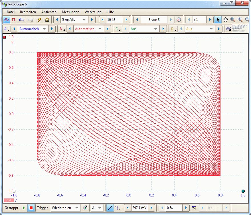 IQ-Reflektor schrieb: > Aber vielleicht gibt es ja DSO mit gescheiter x-y Interpolation und > Darstellung. Also mir reicht die Darstellung bei meinem Scope. Als Beispiel ein 1kHz + ein 10000.1 Hz Lissajous-signal aus einem Funktionsgenerator. @To: zur Eingangsfrage: Die Frage ist halt ob Dir "max 6000 Punkte" Speichertiefe reichen. (bei 0.1 sek Erfassungsdauer sind das max 60 kHz Abtastrate). Ich persönlich halte für digital-Anwendungen (PWM, Protokollanalyse) Speichertiefen unter 1Ms (besser 10Ms) für kaum brauchbar. Gruß Anja