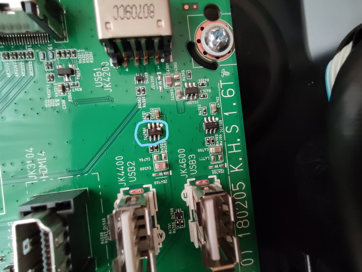 Ich hab den Fernseher auch. Man sollte meckern gehen, dass der Hersteller ZD4700 nicht eingebaut hat, die zum Schutz vor Überspannung vorgesehen war, aber ab Werk nicht montiert wurde. Mangel ab Übergabe, Gewährleistung 2 Jahre. Der Chip wird ein USB Überstromschutzschalter sein, der ab 500mA die +5V abschaltet. Keine Ahnung welcher. Klick dich z.B. bei Mouser durch. Denn die Datenleitungen haben ihren eigenen Schutz, D4700, und der ist in wohl Ordnung.