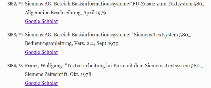 Die Bitsavers.org haben leider unter Siemens nichts gelistet. http://cartoon.iguw.tuwien.ac.at/fit/2001/fit03/entstehung_3.html vielleicht ist das Textsystem 580 identisch? die drei Literaturangaben oben hatte springerlink. https://ifworlddesignguide.com/entry/11448-siemens-system-mobel-sichtgerate-siemens-textsystem-5524 das hier scheint etwas neuer zu sein, jedenfalls nicht identisch Ich hatte mal versucht sowas ähnliches zu reparieren. Das THW hatte es irgendwoher geschenkt bekommen aber der Einfachheit halber waren zur Demontage die Verbindungskabel durchgeschnitten worden. Natürlich weder Kabelfarben noch sonstige Unterscheidungsmerkmale das Adern. Ich weiß nur noch dass der dicke Trafo erst mal den 16A-Sicherungsautomat auslöste. Das hatte aber noch keine Floppies, sondern Lochstreifen.
