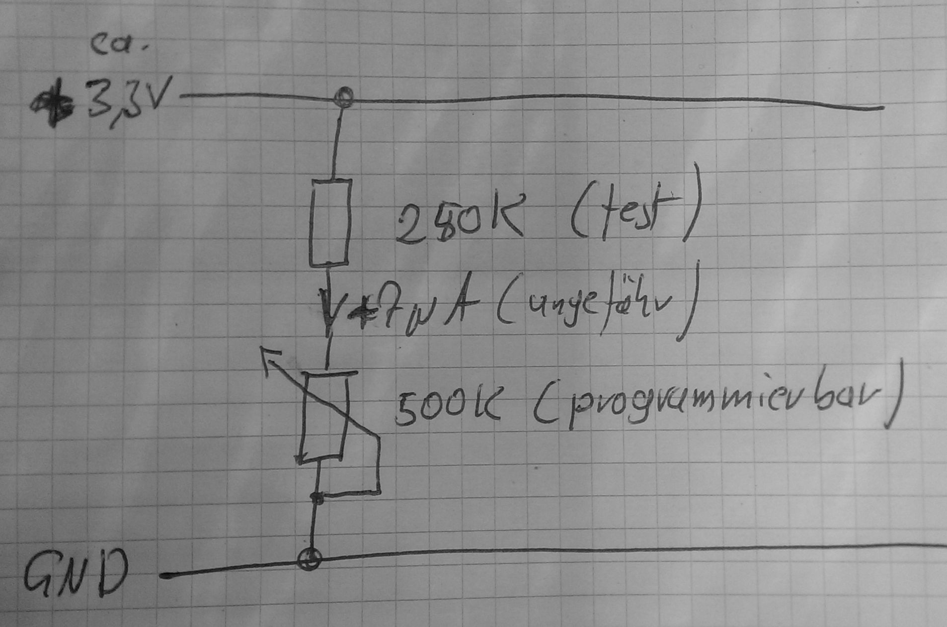 Dergute W. schrieb: > Andreas V. schrieb: >> Messverstärker fangen dann an zu >> spinnen, > > Was fuer Messverstaerker? Auf keinem deiner Karoblaetter oder sonstigen > Texten ist ein Messverstaerker erwaehnt. > > Andreas V. schrieb: >> ich habe die Problematik beschrieben. siehe oben und Bild. Besser gehts >> nicht. > > Das hab' ich heut' frueh nicht geglaubt und ich glaub's jetzt auch > nicht. Aber ich glaub, es ist mir wurscht. > > SCNR, > WK Nochmal: Die Verstärker etc. sind austauschbar. Die haben alle komplett andere Werte. Die werden als Blackbox ausgeliefert und sind jedes Mal anders. Also ist das keine Konstante. Wie gesagt: Ich brauche einen variablen Widerstand mit einigen hundert Kiloohm. Das ist das einzige was immer gleich bleibt. Keine Change etwas genaueres zu formulieren als das. Was ist an einem Spannungsteiler an 3,3V nicht zu verstehen?