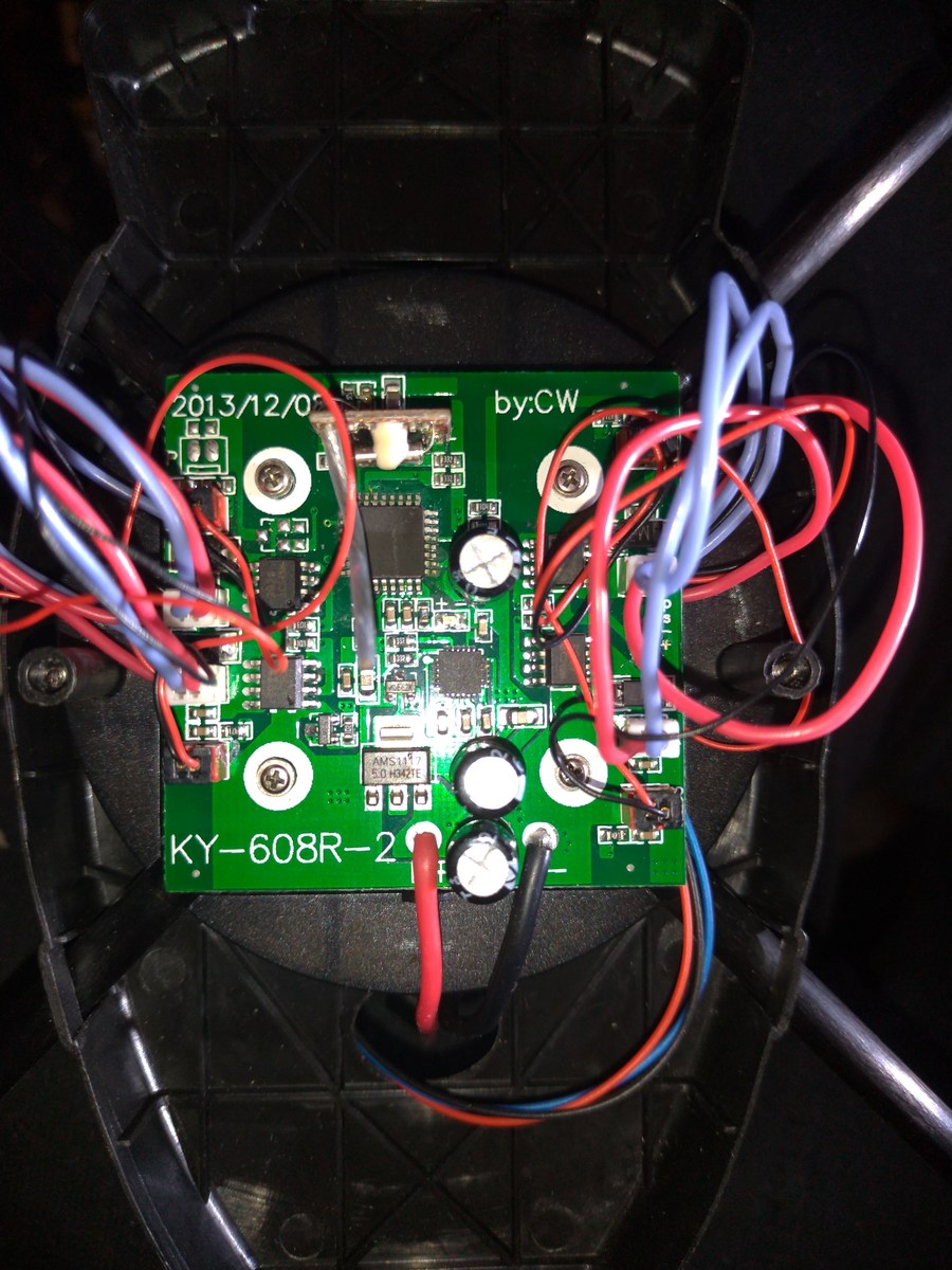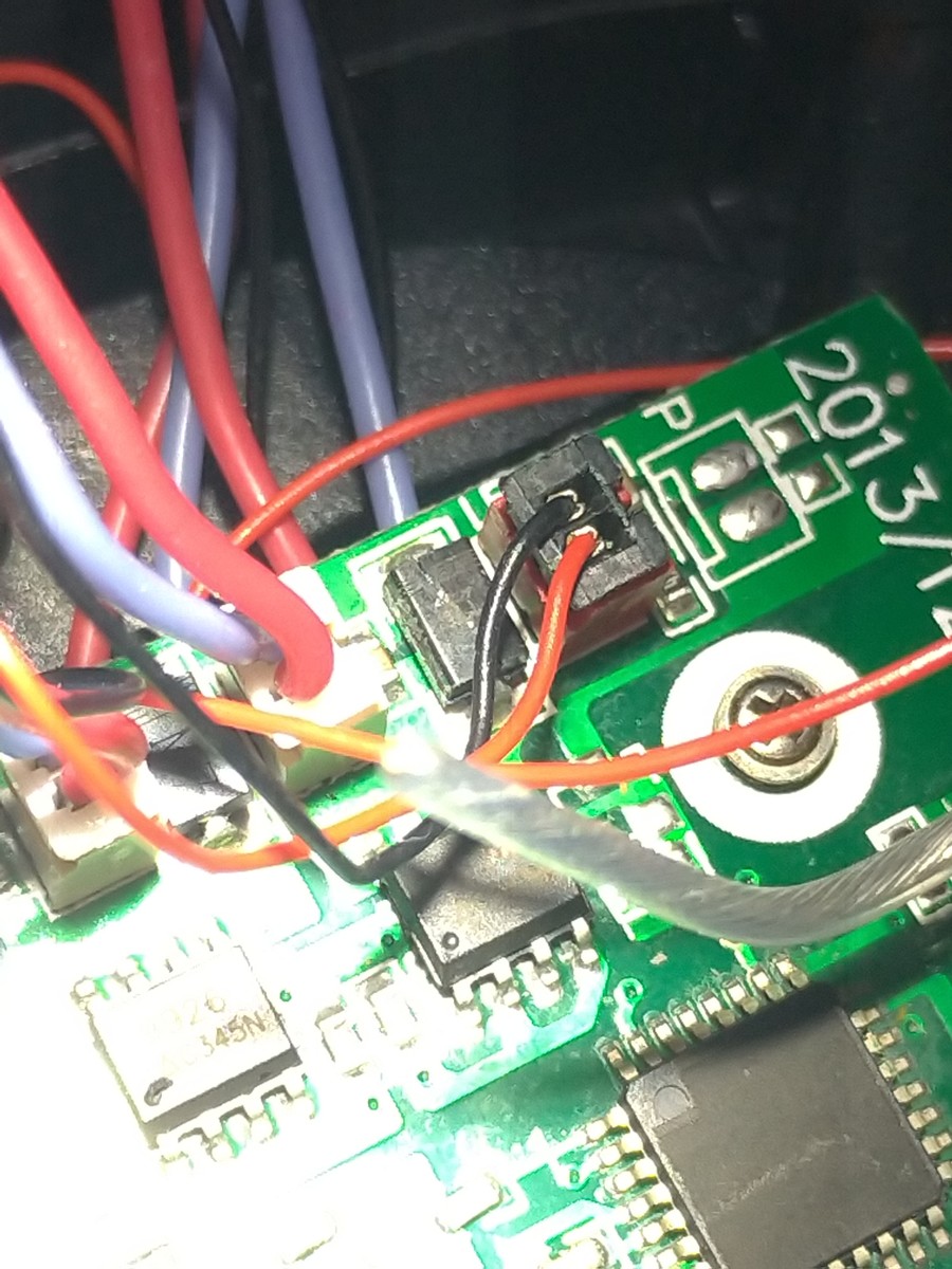 Das erste Gebot der Fehlersuche: "Thou shall measure voltages" Aus dem Akku sollten ja 6-8V rauskommen. Der AMS1117 sollte daraus stabile 5V machen. Ansonsten auch mal die mosis (die soic Käfer) auf kurzschlüsse prüfen. Wenn das Ding irgendwo nen richtigen Kurzen hat hat es evtl. auch irgendeine Schutzschaltung in den Akkus getriggert. PS: Die Dioden sind zwar dem Anschein nach kaputt, aber dürften nur die Induktion beim PWMen des Motors fressen. Die Beleuchtung (danach sehen die dünneren Kabel aus) sollte eigentlich trotzdem leuchten.