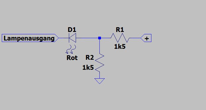 > > Wenn du nur wenig Bauteile (Widerstände, Transistoren, Dioden) auf > Vorrat hast, würde es auch helfen, diese mal aufzulisten. Vielleicht > kriegen wir das hin, ohne dass du nochmal einkaufen musst. > > Hast du einen TL431, Operationsverstärker oder CMOS Schmitt-Trigger > (CD4584B oder CD40106B) vorrätig? So, ich habe ein 2,2k Ohm Widerstand zwischen Lampenausgang und dem Plus geschaltet. Gemessen habe ich zwischen Lampenausgang und Masse. So habe ich die Zeichnung oben verstanden (sorry, ich bin halt nicht vom Fach). Gemessen habe ich eine Spannung von 13,75V und 0V, je nachdem, ob der Lampenausgang geschaltet war oder nicht. An Material habe ich fast nichts da, nur folgende Bauteile: Transistoren: BC517 BC547 Widerstände: 1,5k 2,2k 15k 47k Sonst leider nichts. Weitere Bauteile zu beschaffen wäre aber wirklich nicht das Problem.