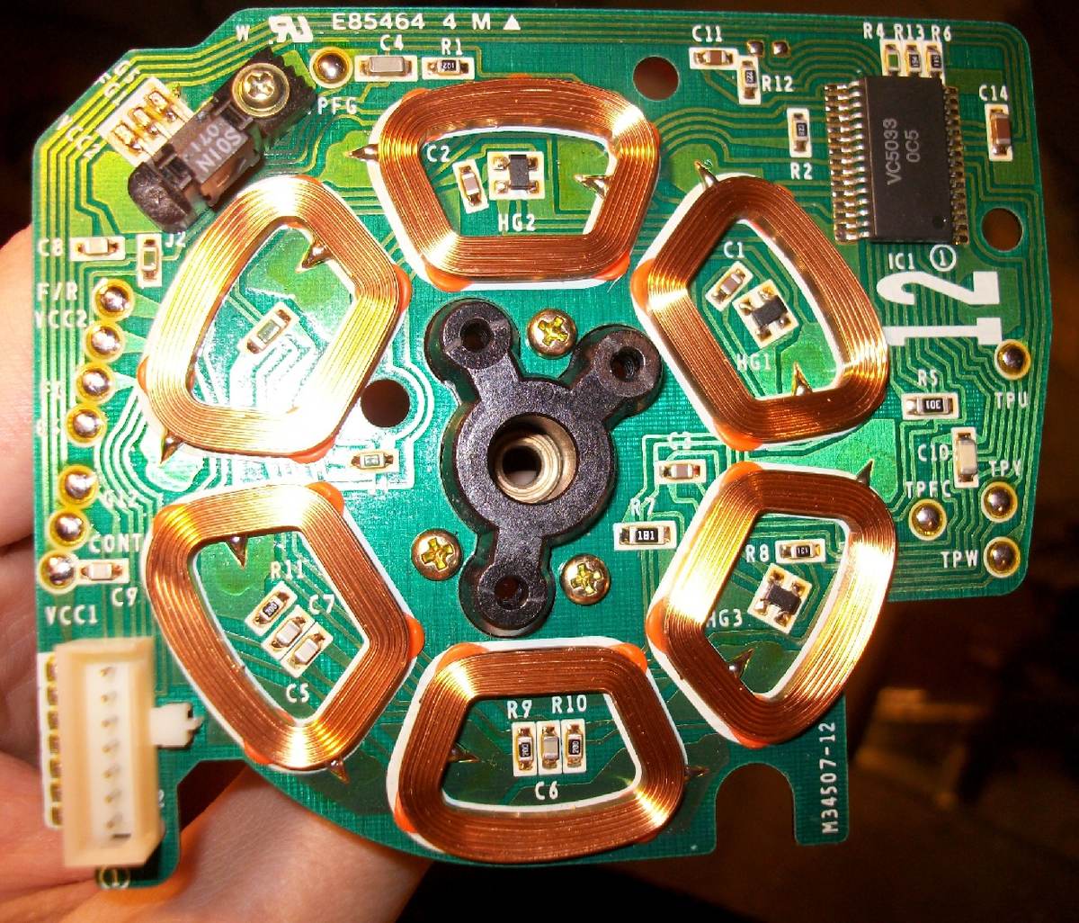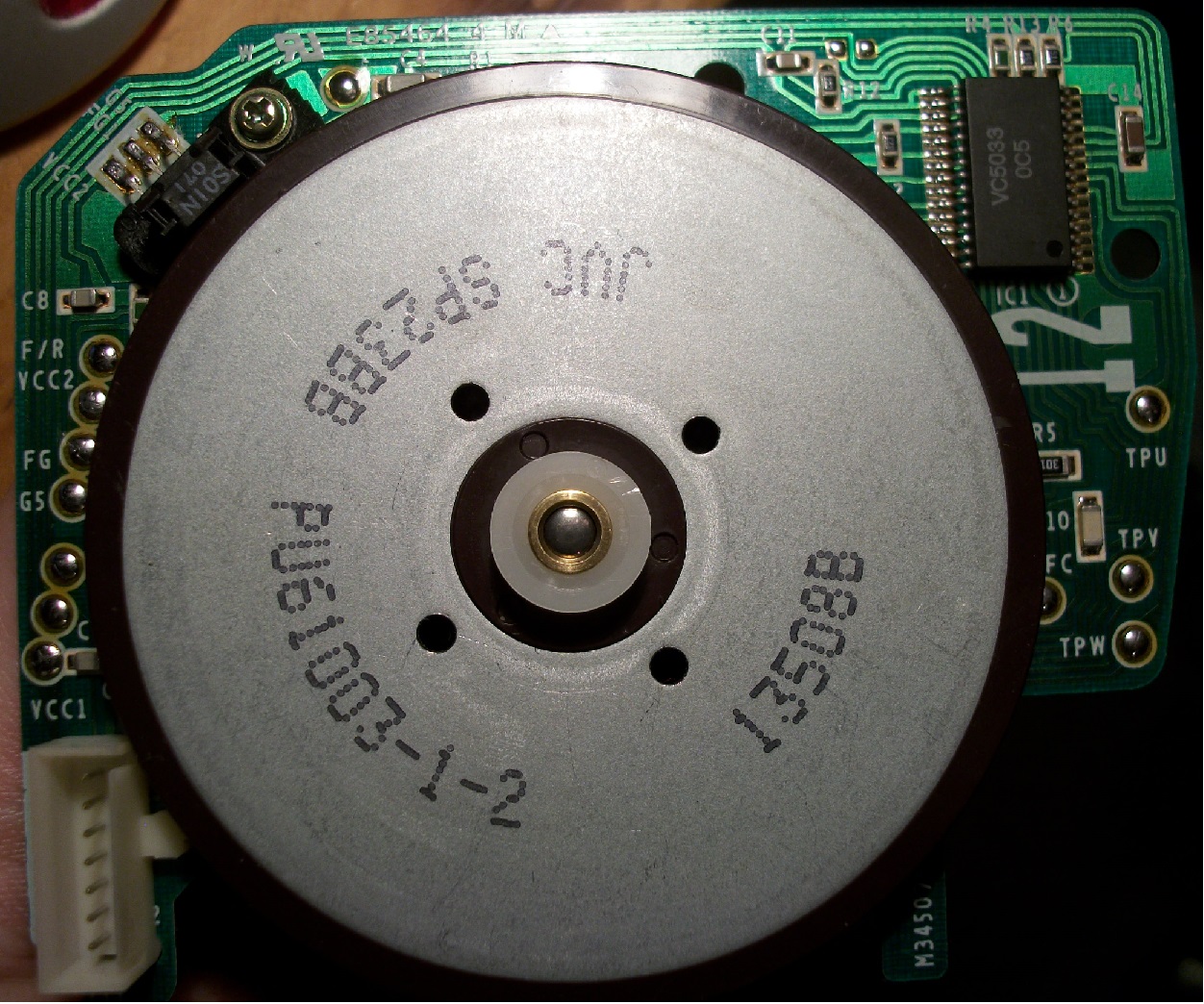 Hallo zusammen, ich habe schon als Kind gerne Video-Rekorder zerlegt und war enttäuscht das ich den Capstanmotor oder die Videotrommel nie autonom zum laufen bekommen habe. Nun vor einiger Zeit fiel mir doch noch mal, ist ja mitlerweile selten geworden, ein Videorekorder zum zerlegen in die Hände und habe wieder den Capstanmotor aufgehoben. Leider ist der Rest vom Rekorder schon im Müll. Dachte heutzutage wäre es kein Problem mehr das Datenblatt zu dem Treiber-IC (VC5033) zu finden. Tja denkste, nichts zu finden. Aber jetzt soll das Ding einfach mal aus Spaß an der Freude trotzdem zum drehen gebracht werden. Glücklicherweise sind diverse beschriftete Testpunkte auf der Leiterplatte. Die sieben Testpunkte links über der Buchse liegen parallel zu dieser und sind mit folgenden Kürzeln beschriftet. Und ich habe gleich mal meine Vermutung was sie bedeuten können dahintergeschrieben. F / R --> Forward / Reverse (5V Eingang, high bzw low Signal ändert die Drehrichtung des Motors) VCC2 --> +5V FG --> "Frequency Generator" oder "Feedback Generator" (Ausgang zum messen der Drehgeschwindigkeit. Kann unbeschaltet bleiben) G5 --> Ground 5V (Verbinden mit G12) G12 --> Ground 12V (Verbinden mit G5) CONT --> Control (Ist ein Steuereingang. Aber wie wird gesteuert?) VCC1 --> +12V Auf dem Board ist noch ein 3 poliger Sensor an dessen Pinbeschriftung auf dem Board ich jetzt abgeleitet habe, dass G5 und VCC2 zusammengehören. Frage 1.) Was muss ich für ein Signal an den Control Eingang anlegen? Analogspannung? PWM? Welche Frequenz? Welche Spannung? Was war häufig/typisch? Frage 2.) Der Rotor hat ja ein Ferrit-Ringmagnet mit abwechselnden Nord- und Südpolen. Nun ist da ganz außen rum aber noch mal so ein brauner Plastikring? Der Ring sieht verdächtig nach dem gleichen Material aus, wie der Magnetstreifen aus einer Kühlschranktürdichtung. Daher meine Vermutung, kann es sein das dieser Ring mit einer ganz feinen Auflösung an Nord- Süd- Polen magnetisiert ist, welche der Sensor ausliest um die Drehgeschwindigkeit exakter bestimmen zu können, als es mit dem normalen Ferrit-Ringmagnet mit seinen wenigen Nord- Südpolen möglich wäre? Danke für eure Hilfe/ Aufklärung. Gruß Sven