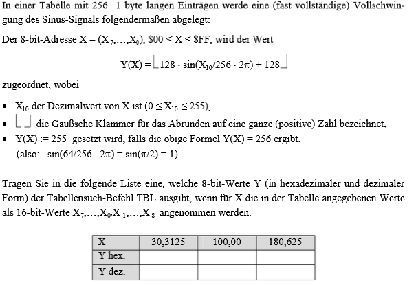Für die Lösung mußt du die Werte der Sinus-Tabelle für die Indizes (beginnend von 0) 30, 31, 100, 180, 181 ermitteln. Wenn dir klar ist warum diese, bist du auf dem richtigen Weg. PS: "Embeded Systems" und WI ist keine alltägliche Mischung.