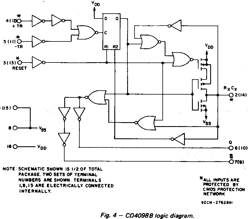 Nur die beiden TR-Pins sind mit dem Clock-Eingang des Flip-Flops verbunden, eine Flanke am Reset-Eingang wird also nicht triggern. (Im CD4538B-Datenblatt von National Semiconductor ist das better erklärt.) Der CD14538B hat Schmitt-Trigger-Eingänge.