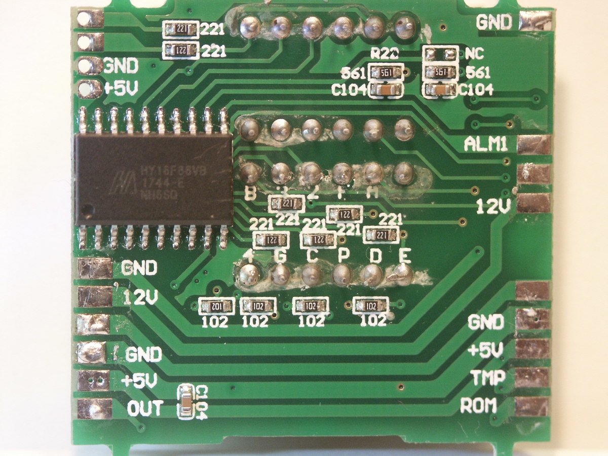 Hallo, ich suche verzweifelt nach näheren Unterlagen zu diesem Controller, HY16F88V8. Er ist Teil einer Anzeigeplatine und ist sicher programmierbar. Durch Analyse habe ich folgende Pin´s herausgefunden: 20 -> +5V 10 -> GND 12 -> Analog in (ADC) 13 -> Analog in (ADC) alle anderen sind Digital I/O Es würde mir auch sehr helfen, wenn jemand einen Controller weiß , für den dieses Pin-Out passt. Der ADC sollte 12 Bit haben.