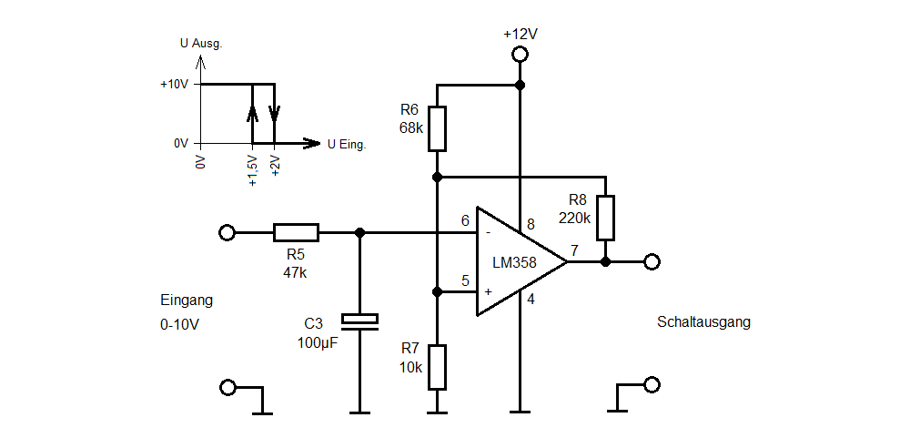 Ich verstehe das so: Alle Spannungen über 1,5 Volt sollen am Ausgang 1,5 Volt erzeugen und alle Spannungen unter 1,49 Volt sollen am Ausgang 0 Volt erzeugen.