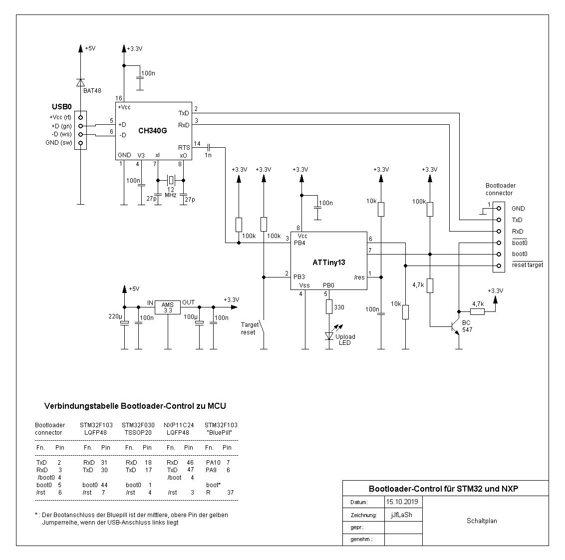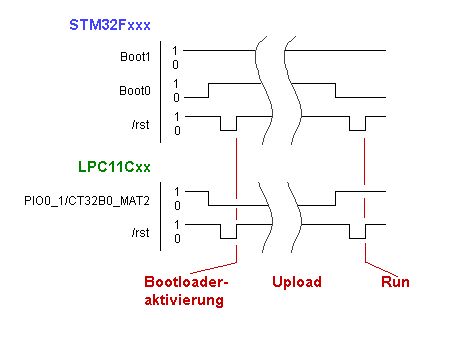 Um es vorwegzunehmen, die hier vorgestellte Software funktioniert nur unter Linux ------------------------------------------------------------------------ --- Nachdem ich ein paar (wenige male) darauf angesprochen wurde, wie ich Code in die Controller uploade, möchte ich hier eine meiner Methoden vorstellen, die ich neben ST-Link, JTAG und dergleichen verwende. Eine "schöne und einfache" Art versprechen Bootloader (wenn man davon absieht, dass über einen Bootloader nicht gedebugt werden kann). Für den STM32F103 taucht hier immer wieder der Bootloader auf, der auf ein ehemaliges Maple-Leaf Project aufsetzt und federführend von im Netz bekannten Roger Clark aus Melbourne aufgesetzt wurde. Dieser Bootloader funktioniert, aber mir war das ein zu großes "gefrickel" und zu dem arbeite ich gerne mit einer nativen seriellen Schnittstelle controllerseitig. Schön ist, dass die STM32 und die LPC Mikrocontroller integrierte Bootloader für serielle Datenübertragung schon von Haus aus besitzen und somit muß den Controllern zur Benutzung keine Software aufgespielt werden. Alles könnte so schön sein, wenn... ja wenn das Aktivieren des Bootloaders der Chips nicht so ungeschickt wäre. Taster und/oder Steckreihen an die Anschlüsse für Boot0 und Reset anbringen (wie bspw. bei der Bluepill) ist beim Arbeiten irgendwie "unschön", wenn diese für jeden Upload verändert werden müssen. Welche logischen Pegel an die Anschlüsse angelegt werden müssen ist dem Impulsdiagramm (hier als hinzugefügtes Bild) zu sehen. Aus diesen Überlegungen heraus entstand eine Schaltung, die ich Bootloader-Control getauft habe. Ein ATtiny13 legt die benötigte Impulsabfolge an die entsprechenden Controller an. Wann der Bootloader aktiviert werden soll, wird über die RTS Leitung der seriellen Schnittstelle entschieden. 3 Impulse auf dieser Leitung veranlassen den ATtiny, den Bootloadermodus an dem STM32 oder LPC Microcontroller zu aktivieren, 3 weitere Impulse schalten diesen Modus wieder aus und reseten den Controller. Um einen Upload durchführen zu können, habe ich die bekannten Programme STM32FLASH und LPC2ISP modifiziert, damit diese den ATtiny steuern können. Die gezeigte Schaltung hier arbeitet mit dem sehr preiswerten CH340G, zusammen, aber eine Versuchsschaltung mit einem FTDI hat gezeigt, dass dieses auch funktioniert. Zum CH340 ist zu sagen, dass der bei Linux vorhandene Kerneltreiber einen bekannten Parityfehler hat (und deshalb das Programm STM32FLASH nicht mit diesem Treiber funktioniert). Im Archiv ist deshalb ein Patch enthalten, der diesen Fehler behebt. Desweiteren hat sich gezeigt, warum auch immer, dass zwei Ryzen AMD-Boards den CH340 genau einmal ansteuern kann und danach müsste jedesmal der Chip vom USB getrennt werden. Damit man dieses nicht händisch durchführen muss, gibt es im Ordner ch340reset ein Progrämmchen, das den CH340 reseten kann. Es empfiehlt sich, vor dem eigentlichen Upload dieses Programm auszuführen, damit der CH340 auch garantiert die Upload-Daten transferiert. Im Ordner attiny_src ist die Firmware für den ATtiny enthalten. Das ganze hört sich jetzt aufwändiger an, als es ist. Der Treiberpatch ist einmal durchzuführen, und ein ch340reset und ein Upload erfolgt in einem Makefile (was auch der Grund ist, warum das alles Konsolenprogramme sind). Das modifierzierte Uploadprogramm für STM32 heißt hier nun: stm32flash_rts Das modifizierte Uploadprogramm für den LPC11 heißt hier nun: lpc-flash Die Kommndozeilenparameter für die beiden Programme wurden beibehalten, wie ein Upload aufgerufen wird ist in dem Einzeilenscript testupload zu sehen. -------------------------- Sollte es von Interesse sein, kann ich auch gerne berichten, wie man diese Programme in Arduino implementiert (bei installierter STM32F103 Unterstützung) um bspw. Arduino mit BluePill und der hier vorgestellten Uploadmethode zu nutzen.