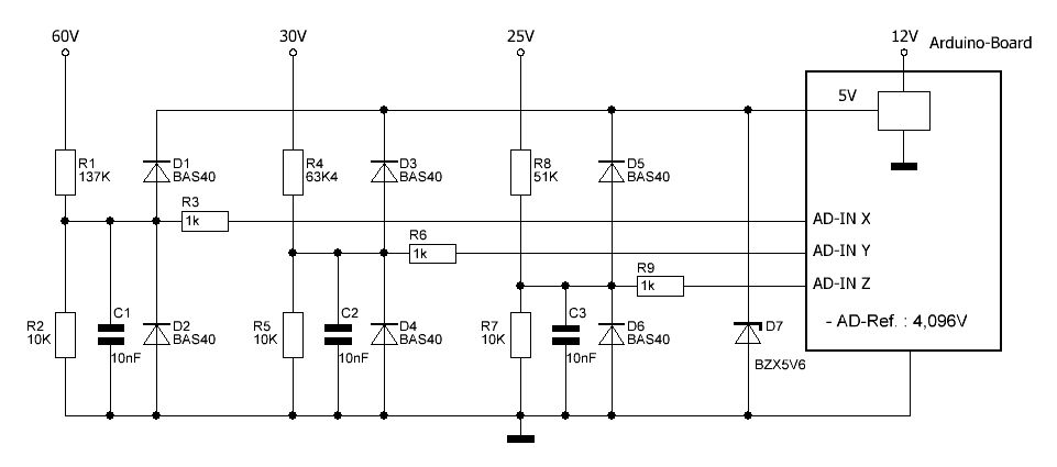 Nils R. schrieb: > Anbei nmal ein Update Du teilst auf verschiedene Spannungen runter (2.5, 5 und 12V). Sinnvoller ist es, alle auf das gleiche Level zu teilen, um die maximale Auflösung zu erreichen. 12V ist keine gute Idee, da geht der Atmega kaputt. 5V ist auch nicht ideal, denn dann misst du gegen die 5V-Versorgung vom Atmega, die nicht als Referenz gedacht ist. Besser ist es, eine der internen Referenzen (0.55, 1, 1.5, 2.5 oder 4.3V) zu nutzen und dann auch auf diese Spannung zu teilen. Welche Referenz die stabilste ist, kannst du ja mal im Datenblatt des Atmega nachgucken.
