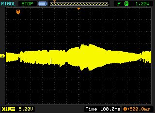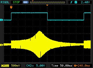 Hallo zusammen, ich möchte einen Tiefenmesser (Sonar) auf Basis des PW0268 von ProWave entwickeln. Einen Transducer für 200 KHz habe ich bereits gekauft. ProWave bietet auch einen abgleichbaren 1:10 Anpassungsübertrager an, allerdings für 235 KHz ausgelegt. Der ist nicht einfach zu bekommen, ich bin bei ebay in Italien fündig geworden und habe mir den trotz der sehr hohen Versandkosten von 20 EUR bestellt. Die Hoffnung war, dass ich den Übertrager auf 200 KHz abgleichen kann. Um das einmal zu testen, habe ich mit dem Funktionsgenerator über 10 nF einen Sweep auf die Sekundärseite des Übertragers gegeben und mit dem Oszi direkt am Übertrager gemessen. Anbei der Screenprint von der Messung. Der Sweep ist von 1 bis 100 KHz, die blaue Linie zeigt den Trigger-Ausgang vom Signalgenerator. Man sieht deutlich ein Spannungsmaximum bei 40 KHz. Das kommt mir doch ein wenig merkwürdig vor. Mache ich einen generellen Fehler bei dem Messaufbau oder könnte es sich um einen falsch gelieferten Übertrager handeln, der eigentlich für 40 KHz ausgelegt ist? Viele Grüße, Christian