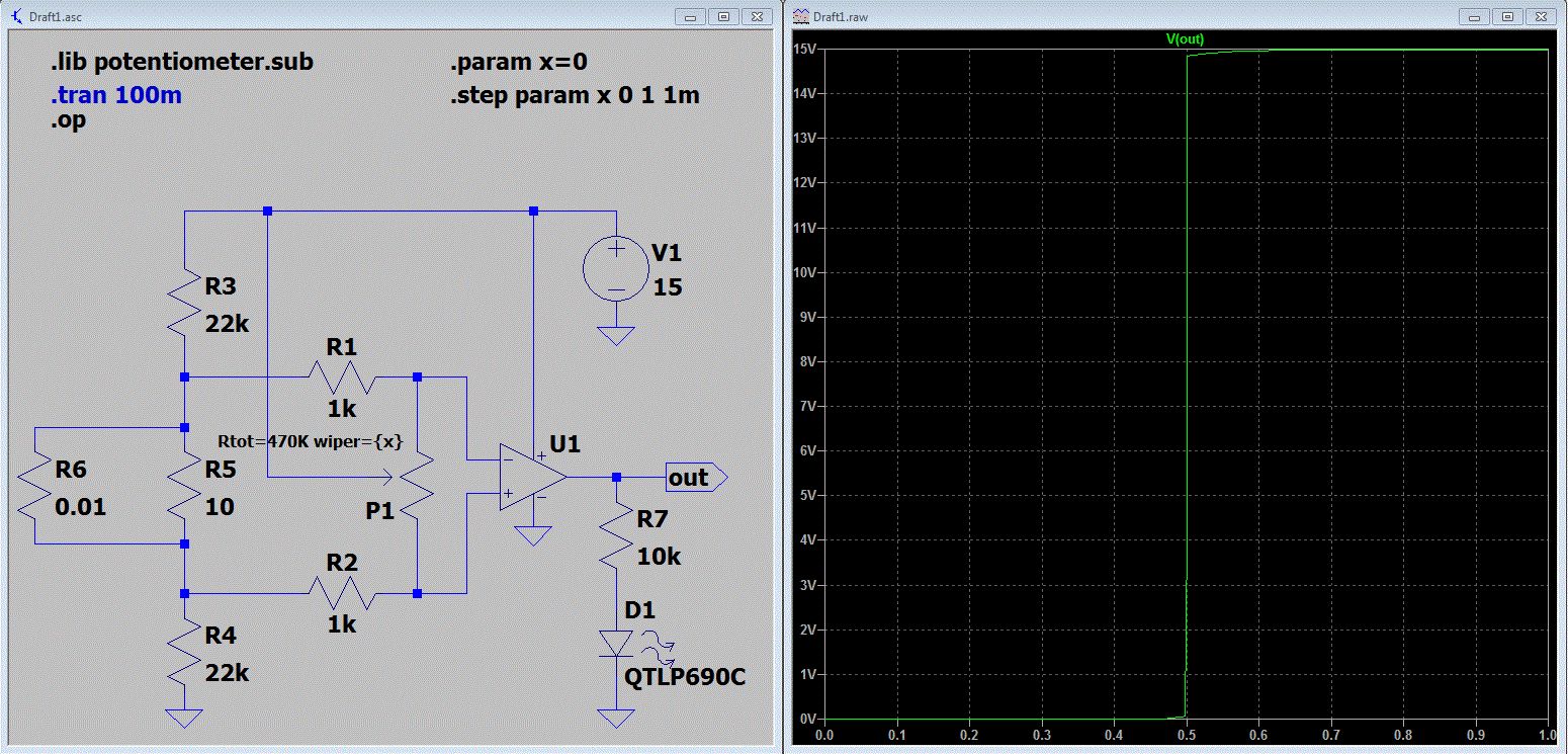 Noch ein paar Tipps. 0,01 geht nicht. In LTspice muss immer "." als Dezimalzeichen verwendet werden. 0.01 Statt 1000 ist es eleganter 1k zu schreiben. .lib Dateiname sucht nur nach subcircuits in der Datei. .inc Dateiname nimmt alle Zeilen als SPICE-Zeilen. Bei deinem Beispiel geht beides da eh nur subcircuits, genauer gesagt eines, in deiner Datei sind. Am Poti steht wiper=0.5. Das bedeutet der Abgriff steht in der Mitte.