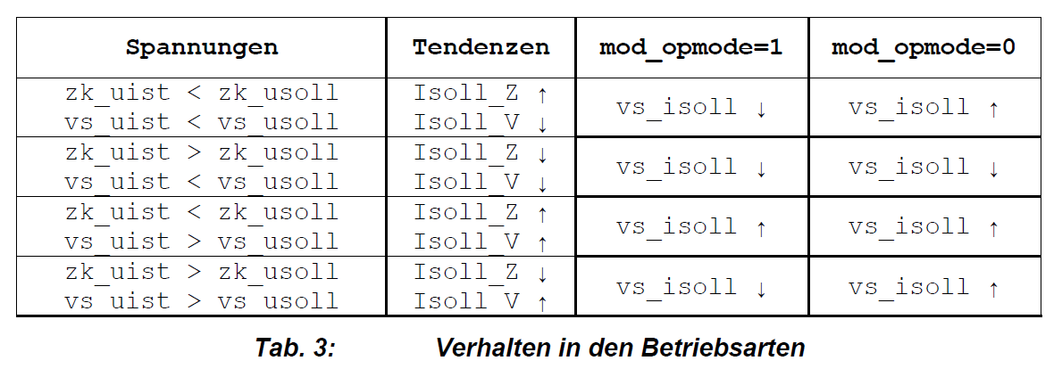 Hallo zusammen, vielleicht kann mir hier jemand ein gutes Bild der Reglung von Spannungswandler vermitteln. Oder nur Begrifflichkeiten klären, wie sich z.B "Spannungs- und Stromgeregelung" zu "spannungs -oder stromgeführtem Betrieb" unterscheidet. Ich Blicke da gerade schwerlich durch. Aber komme ist erstmal zum Untersuchungsobjekt: für eine Studienarbeit soll ein 2,5kW bidirektionaler DC/DC Wandler 0..30V Variable Spannungsseite (VS) zum 355-495 V Zwischenkreis (ZK) mit je einem PID Regler an Ein- und Ausgang für den Anschluss von Quelle, Puffer oder Last vorbereitet werden. Die Steuerung ist digital realisiert mit sehr umfangreichen Einstellmöglichkeiten. Die wesentliche Grundparametrierung besteht aber lediglich aus: U_soll VS-Seite U_soll ZK-Seite I_max VS-Seite I_min VS-Seite (negativ für Leistungsflussrichtung ZK --> VS, bzw 0) Dazu gibt es zwei Betriebsmodi (0 und 1), die über die Priorisierung der Regler entscheiden. Bei opmode = 0 wird der minimale Stromvorgabewert genommen, das andere mal der Maximale. Die angehängte Tabelle erläutert das Verhalten der Regler besser! Wie ich es verstehe, ist der Wandler von Haus aus erstmal Spannungs- und Stromgeregelt: Einer der beiden Spannungsregler errechnet intern den erforderlichen Sollstrom und stellt diesen ein (Current Controll Mode, innerer (I) und äußerer (U) Regelkreis) Jetzt würde ich gerne eine angeschlossene Quelle Spannungs- oder Stromgeführt betreiben, also im ersten Fall wird die ZK-Spannung bei Belastung konstant gehalten und Strom wird nach Bedarf nachgeregelt und im zweiten Fall soll durch den Wandler ein konstanter Strom Richtung Zwischenkreis (der gepuffert ist) vorgegeben werden. Die Spannungsregelung des Zwischenkreises ist klar: In Betriebsmodus 1 wird die Zwischenkreispannungs konstant gehalten, solange VS-seitig der Spannungs-Istwert größer ist als der eingestellte Sollwert. Erst bei unterschreiten des Sollwertes (zB. bei Überlast einer Brennstoffzelle) wird der VS-seitige Regler aktiv und verhindert das mehr Leistung Richtung Zwischenkreis geschoben wird. Probleme bereitet mir ein "Stromgeführter" betrieb. Wie lässt sich der Strom auf einem gewünschten Sollwert einstellen wenn der doch intern geregelt wird, mit Betreibsmodus 0 oder dass immer die obere Stromgrenze erreicht wird? Oder kann ein DC/DC Wandler überhaupt Energieflüsse steuern? Hoffe ich konnte meine Schwierigkeiten einigermaßen erklären...