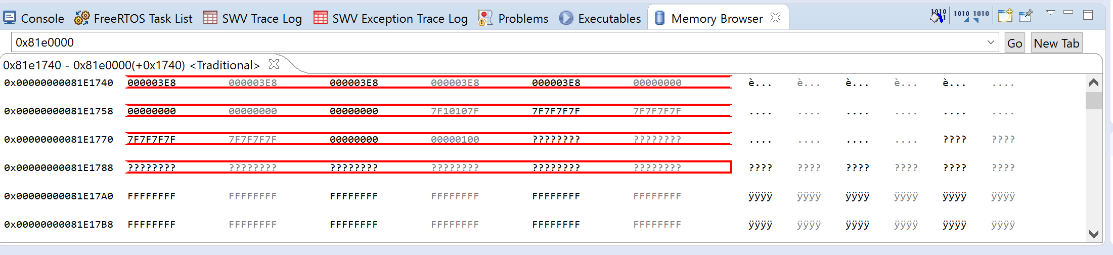 Hallo zusammen, ich habe einen Teil des Flashs eines STM32H743 für das nichtflüchtige Speichern einiger Programmdaten vorgesehen, d.h. sie werden alle paar Stunden geschrieben. Jetzt kann ich plötzlich, nachdem es einiege Zeit lang funktionierte, einen bestimmten Speicherbereich nicht mehr lesen. Die Speicherung erfolgt inkrementell, d.h. der nächste freie Speicherbereich wird beschrieben und alles gelöscht wenn der Sektor voll ist. Der aktuelle Bereich ist bisher nur ein einziges Mal beschrieben worden, es sollte daher also keine Verschleißerscheinung sein. Alles vor und hinter diesen paar Bytes ist aber weiterhin lesbar, es handelt sich also nur um diese paar Bytes. Im Bild kann man sehen, dass der Memory-Browser an diesen Stellen nur Fragezeichen anzeigt. Ich kann nicht ausschließen, dass das letzte Speichern der Daten in irgendeiner Weise unterbrochen wurde oder Fehlgeschlagen ist. Hat jemand so etwas schonmal gesehen? Kann man verhindern, dass der Prozessor dann direkt in einen Hard Fault geht?