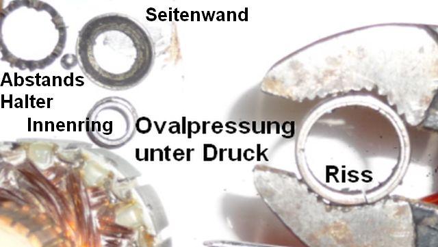 Falls einer dasselbe Problem hat, brauchts nur Arbeitshandschuhe, eine Zange, die das Lager fassen kann, etwas Kleinwerkzeug und fünf Minuten Zeit: Zange in Mittelstellung an den Aussenring ansetzen, zum Oval verpressen bis es klickt und der Seitenschutz aufpringt. Der Rest ist easy. Mit Kleinwerkzeug den Seitenschutz und Abstandshalter heraushebeln, alle Kugeln nebeneinander legen, der Aussenring fällt samt Kugeln ab. Nochmal die Zange gefühlvoll an den verbliebenen Innenring ansetzen und mit der anderen Hand den Rotor unter Drehzug abziehen - fertig. Ich hatte Glück, daß der Abstandshalter oben war, wäre er unten gewesen, häts fünf Minuten länger gedauert.