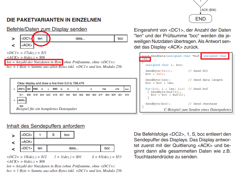 Nachtrag: Habe folgendes im Datenblatt gefunden: "Die Anzahl (len) der Rohdaten pro Paket kann max. 255 Byte betragen. Befehle die größer als 255 Byte (z.B. Bild laden ESC UL ...) müssen auf mehrere Pakete aufgeteilt werden. " Aber wie weiß das Display, daß noch weitere Daten kommen und die Bilddaten am Ende alle gesendet wurden?
