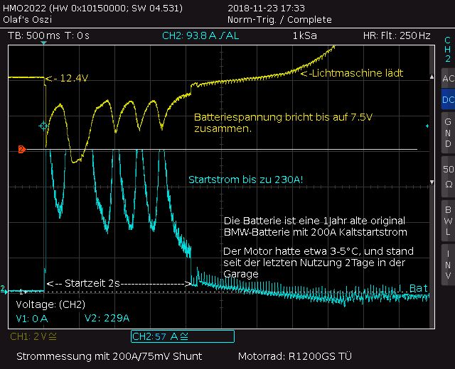 Das Bild zeigt Strom und Spannung am Anlasser meines Motorrads im Winter bei Kaltstart. Wie ihr seht wird dem Anlasser fuer 2s Strom entnommen, nach 3s wird der Strom negativ weil die Batterie laedt und nach 5s geht die Stromaufnahme der Batterie schon deutlich zurueck. Und das war Kaltstart im Winter. Bei warmen Motor braucht der Anlasser 1s oder weniger und der Strom ist natuerlich viel geringer. Mit anderen Worten die Leistungsaufnahme eines Anlasser kann man vernachlaessigen. Was aber extrem wichtig ist das ist der Innenwiderstand der Batterie und der Zuleitung. Oh..und das Motorrad springt im Winter eher schlecht an weil BMW die Batterie unterdimensioniert hat. Deshalb hatte ich das auch mal gemessen. Es wird aber Dinge geben die beim Start/Stop die Batterie viel staerker belasten. Sitzheizung, Lueftermotor, Radio, Licht, usw. Auch wenn ein Auto davon vielleicht einiges abschaltet, aber rechnet doch z.B mal den Verbrauch des Lichts aus wenn ihr eine Minute an der Ampel steht und der Motor aus ist und ihr vielleicht noch den Fuss auf der Bremse habt. Olaf