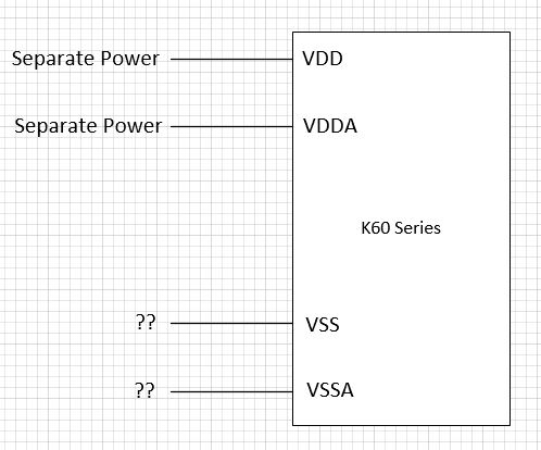 How will it be ensured that digital and analog grounds are isolated for K60 series controller when power supplies for analog and digital supplies are separate. Diagram is attached for clarity. How to connect these two grounds with each other? What circuitry will be needed to ensure these two grounds does not effect each other when they are connected?