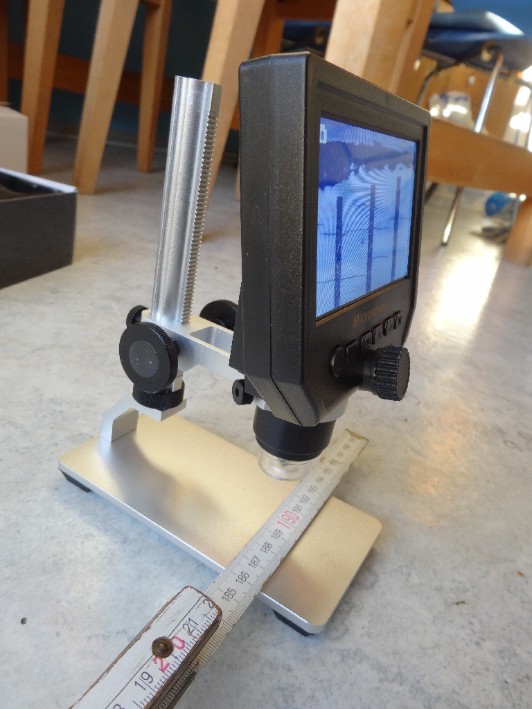 Schön langsam treffen die letzten Teile fürs Experiment ein. Gestern ist der Zerstäuber aus England angekommen. Den schon etwas porösen Schlauch habe ich gegen einen neuen aus Silikon ausgetauscht. Als Ersatz für das Handy + Linse habe ich mir quasi als Weihnachtsgeschenk noch ein Mikroskop mit Bildschirm gekauft. Dieses ist bereits heute eingetroffen. Für mich ist also am 11.12 bereits Weihnachten... Die Verarbeitung ist für den Preis wirklich mehr als ordentlich. Habe auch gleich die unterschiedlichen Vergrößerungen ermittelt. Diese ändert man wie schon gesagt durch Veränderung der Gegenstandsweite. Bei geringem g ist die Vergrößerung höher und vice versa. Die angegebenen 600-fach schafft es natürlich bei weitem nicht aber für meine Bedürfnisse dürfte es trotzdem ideal sein. Immerhin möchte ich ja nur den Abstand der Kondensatorplatten (5 mm) formatfüllend abbilden. Die Vergrößerung ist im Bereich 6- bis 30-fach variierbar. Der Strichabstand beträgt in echt 1 mm! Ich habe mich bewusst für dieses Modell (https://www.amazon.de/gp/product/B07B6H1K9W/) entschieden, weil ich dann das Stativ am leichtesten an meine Bedürfnisse (horizontale Verschiebung) anpassen kann.