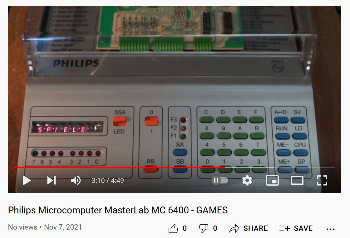 Anscheinend bin ich der erste und einzige auf YouTube mit einem MasterLab; daher wollte ich mal was hochladen. Anbei eine kleine Demo der eingebauten EPROM-"Spiele" - viel Spaß damit: https://www.youtube.com/watch?v=dlj2oZUlRDY Mehr Infos auf diesen hervorragenden Seiten (nicht meine!) http://norbert.old.no/extra/extra3.html http://norbert.old.no/kits/6400/6400.html