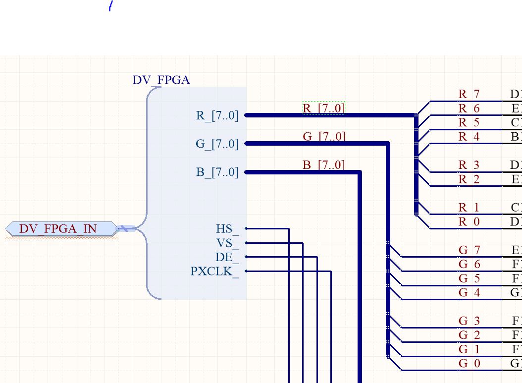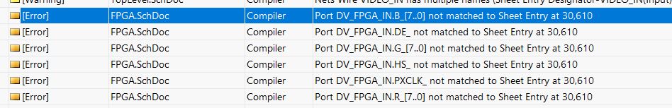 Der Fehler liegt vermutlich in der Verbindung vom Port (DV_FPGA_IN) zum darüber liegenden Sheet. Manchmal hilft es, den Port überall zu löschen, um ihn dann an einer Stelle neu anzulegen und über Synchonize Sheet Entries and Ports von Altium in den verbundenen Sheets anlegen zu lassen.