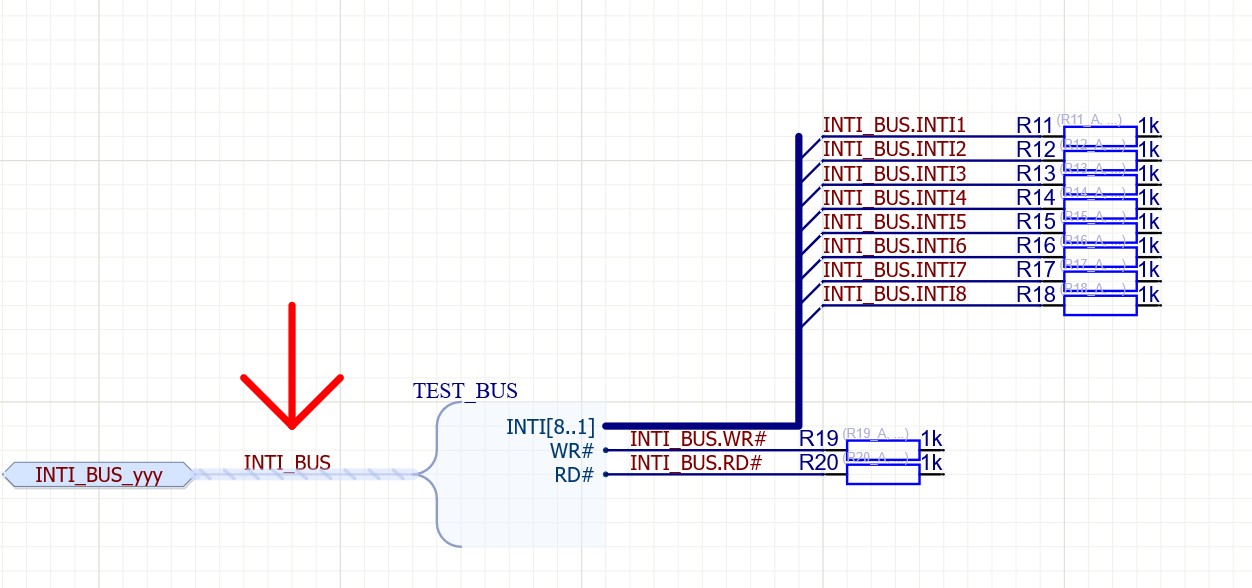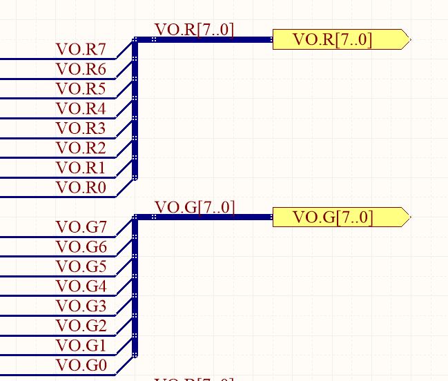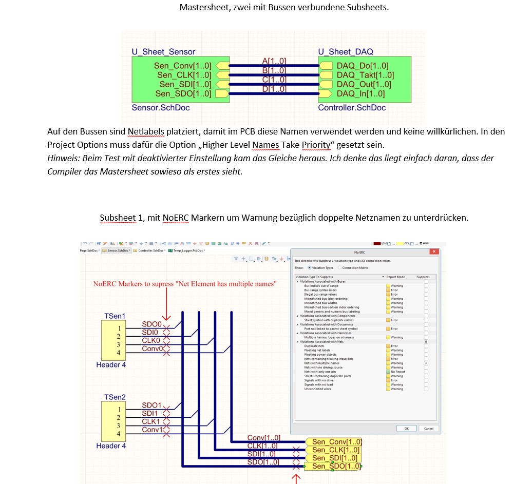 Das Sytem hat ja auch Recht mit duplicate net names. Du verbindest auf dem Master sheet ein Signal VI mit VO. Eine physicalische Verbindung mit zwei Namen, was soll Altium da machen ?. Platziere auf dem Master Sheet (G.jpg) auf dem Bus ein Netlabel z.B. VIO.R[7..0]. Und im Sub Sheet ERC Markers an den Signalen und dem Bus um den System mitzuteilen das duplicate Names OK ist.